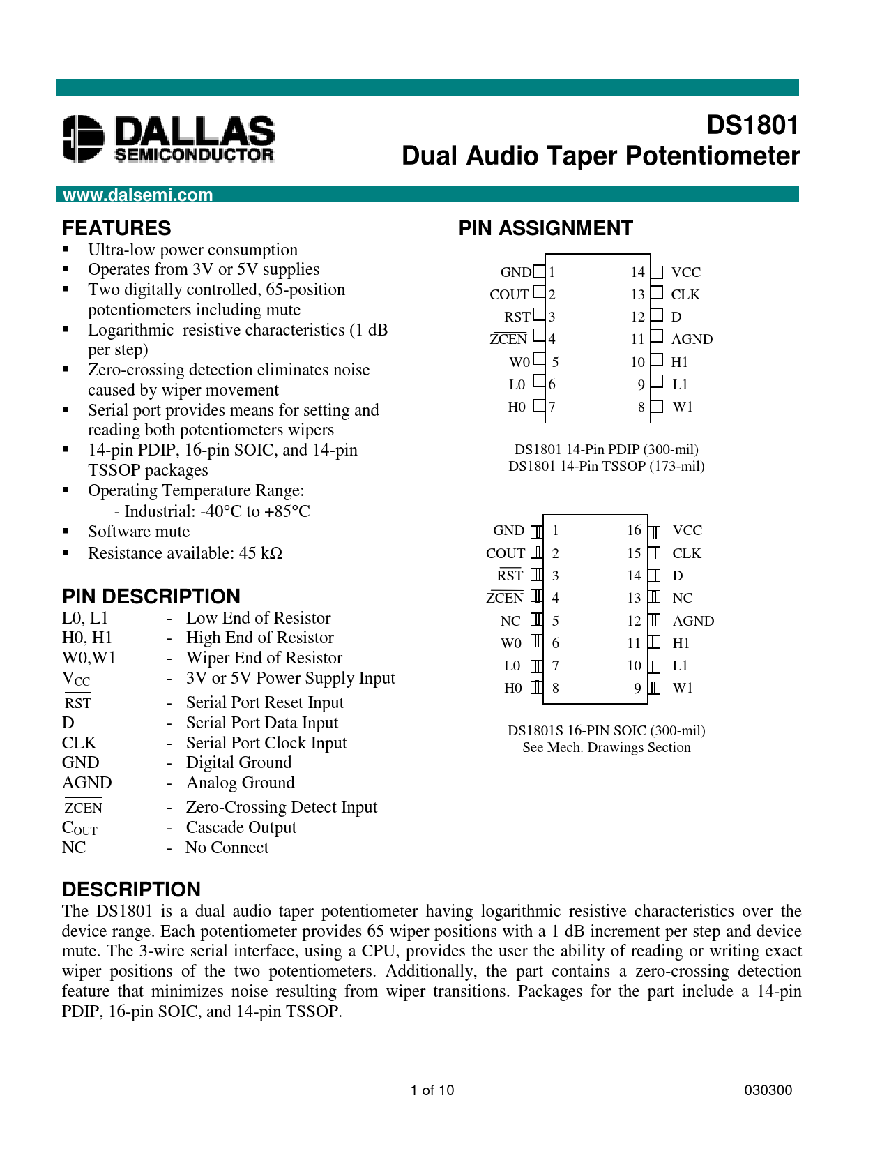 DS1801Dual Audio Taper Potentiometerwww.dalsemi.comFEATURESPIN ASSIGNMENT Ultra-low power consumption Operates from 3V or 5V supplies GND 1 14 VCC Two digitally controlled, 65-position COUT 2 13 CLK potentiometers including mute RST 3 12 D Logarithmic resistive characteristics (1 dB ZCEN 4 11 AGND per step) W0 5 10 H1 Zero-crossing detection eliminates noise caused by wiper movement L0 6 9 L1 Serial port provides means for setting and H0 7 8 W1 reading both potentiometers wipers 14-pin PDIP, 16-pin SOIC, and 14-pin DS1801 14-Pin PDIP (300-mil) TSSOP packages DS1801 14-Pin TSSOP (173-mil) Operating Temperature Range: - Industrial: -40°C to +85°C Software mute GND 1 16 VCC Resistance available: 45 kΩ COUT 2 15 CLK RST 3 14 D PIN DESCRIPTION ZCEN 4 13 NC L0, L1 - Low End of Resistor NC 5 12 AGND H0, H1 - High End of Resistor W0 6 11 H1 W0,W1 - Wiper End of Resistor L0 7 10 L1 VCC - 3V or 5V Power Supply Input H0 8 9 W1 RST - Serial Port Reset Input D - Serial Port Data Input DS1801S 16-PIN SOIC (300-mil) CLK - Serial Port Clock Input See Mech. Drawings Section GND - Digital Ground AGND - Analog Ground ZCEN - Zero-Crossing Detect Input COUT - Cascade Output NC - No Connect DESCRIPTION The DS1801 is a dual audio taper potentiometer having logarithmic resistive characteristics over the device range. Each potentiometer provides 65 wiper positions with a 1 dB increment per step and device mute. The 3-wire serial interface, using a CPU, provides the user the ability of reading or writing exact wiper positions of the two potentiometers. Additionally, the part contains a zero-crossing detection feature that minimizes noise resulting from wiper transitions. Packages for the part include a 14-pin PDIP, 16-pin SOIC, and 14-pin TSSOP. 1 of 10 030300