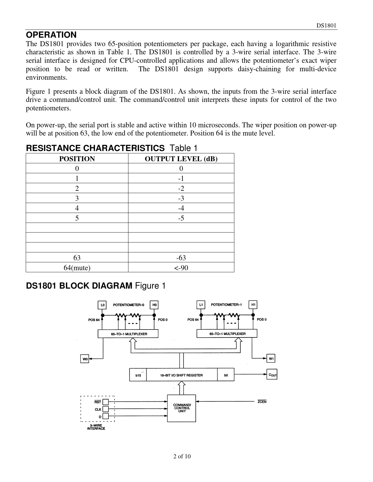 DS1801 OPERATION The DS1801 provides two 65-position potentiometers per package, each having a logarithmic resistive characteristic as shown in Table 1. The DS1801 is controlled by a 3-wire serial interface. The 3-wire serial interface is designed for CPU-controlled applications and allows the potentiometer’s exact wiper position to be read or written. The DS1801 design supports daisy-chaining for multi-device environments. Figure 1 presents a block diagram of the DS1801. As shown, the inputs from the 3-wire serial interface drive a command/control unit. The command/control unit interprets these inputs for control of the two potentiometers. On power-up, the serial port is stable and active within 10 microseconds. The wiper position on power-up will be at position 63, the low end of the potentiometer. Position 64 is the mute level. RESISTANCE CHARACTERISTICS Table 1 POSITIONOUTPUT LEVEL (dB) 0 0 1 -1 2 -2 3 -3 4 -4 5 -5 63 -63 64(mute) <-90 DS1801 BLOCK DIAGRAM Figure 1 2 of 10