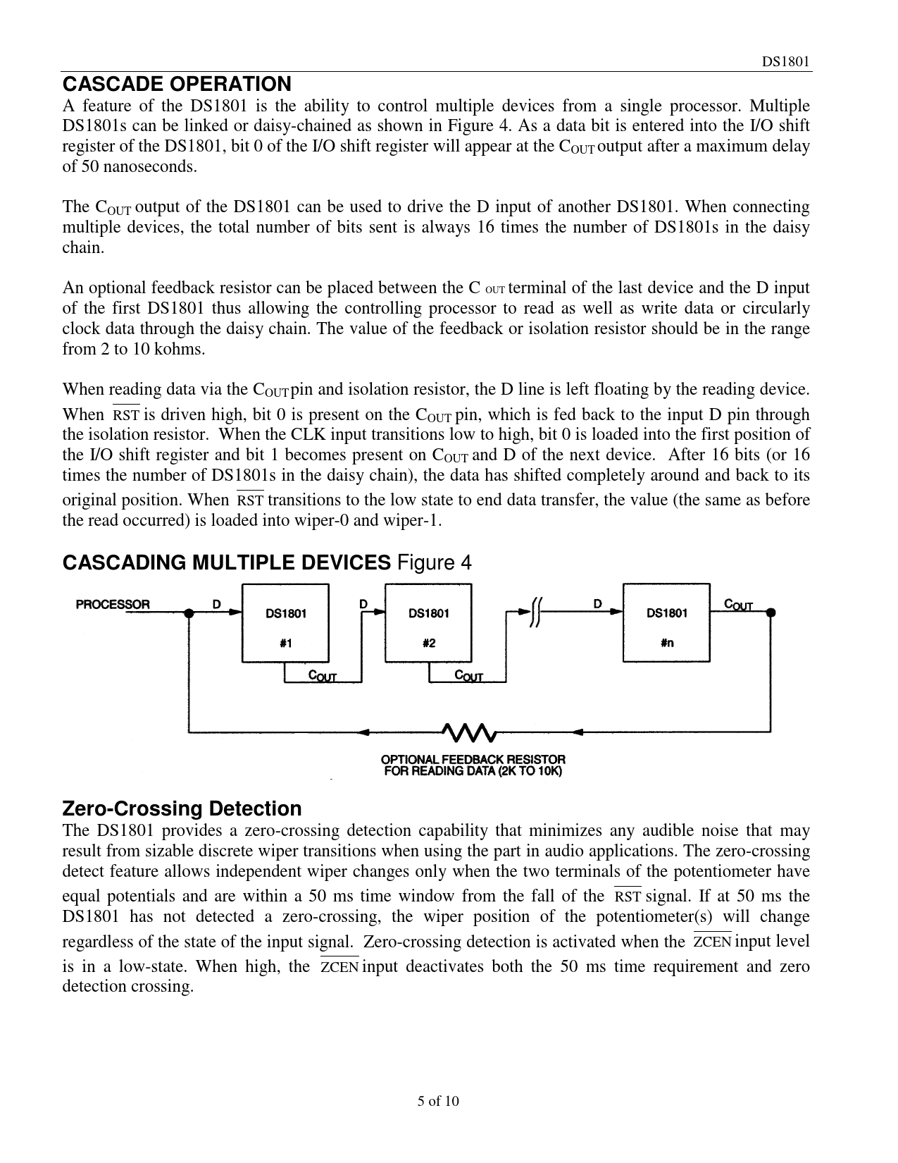 DS1801 CASCADE OPERATION A feature of the DS1801 is the ability to control multiple devices from a single processor. Multiple DS1801s can be linked or daisy-chained as shown in Figure 4. As a data bit is entered into the I/O shift register of the DS1801, bit 0 of the I/O shift register will appear at the COUT output after a maximum delay of 50 nanoseconds. The COUT output of the DS1801 can be used to drive the D input of another DS1801. When connecting multiple devices, the total number of bits sent is always 16 times the number of DS1801s in the daisy chain. An optional feedback resistor can be placed between the C OUT terminal of the last device and the D input of the first DS1801 thus allowing the controlling processor to read as well as write data or circularly clock data through the daisy chain. The value of the feedback or isolation resistor should be in the range from 2 to 10 kohms. When reading data via the COUTpin and isolation resistor, the D line is left floating by the reading device. When RST is driven high, bit 0 is present on the COUT pin, which is fed back to the input D pin through the isolation resistor. When the CLK input transitions low to high, bit 0 is loaded into the first position of the I/O shift register and bit 1 becomes present on COUT and D of the next device. After 16 bits (or 16 times the number of DS1801s in the daisy chain), the data has shifted completely around and back to its original position. When RST transitions to the low state to end data transfer, the value (the same as before the read occurred) is loaded into wiper-0 and wiper-1. CASCADING MULTIPLE DEVICES Figure 4 Zero-Crossing Detection The DS1801 provides a zero-crossing detection capability that minimizes any audible noise that may result from sizable discrete wiper transitions when using the part in audio applications. The zero-crossing detect feature allows independent wiper changes only when the two terminals of the potentiometer have equal potentials and are within a 50 ms time window from the fall of the RST signal. If at 50 ms the DS1801 has not detected a zero-crossing, the wiper position of the potentiometer(s) will change regardless of the state of the input signal. Zero-crossing detection is activated when the ZCEN input level is in a low-state. When high, the ZCEN input deactivates both the 50 ms time requirement and zero detection crossing. 5 of 10