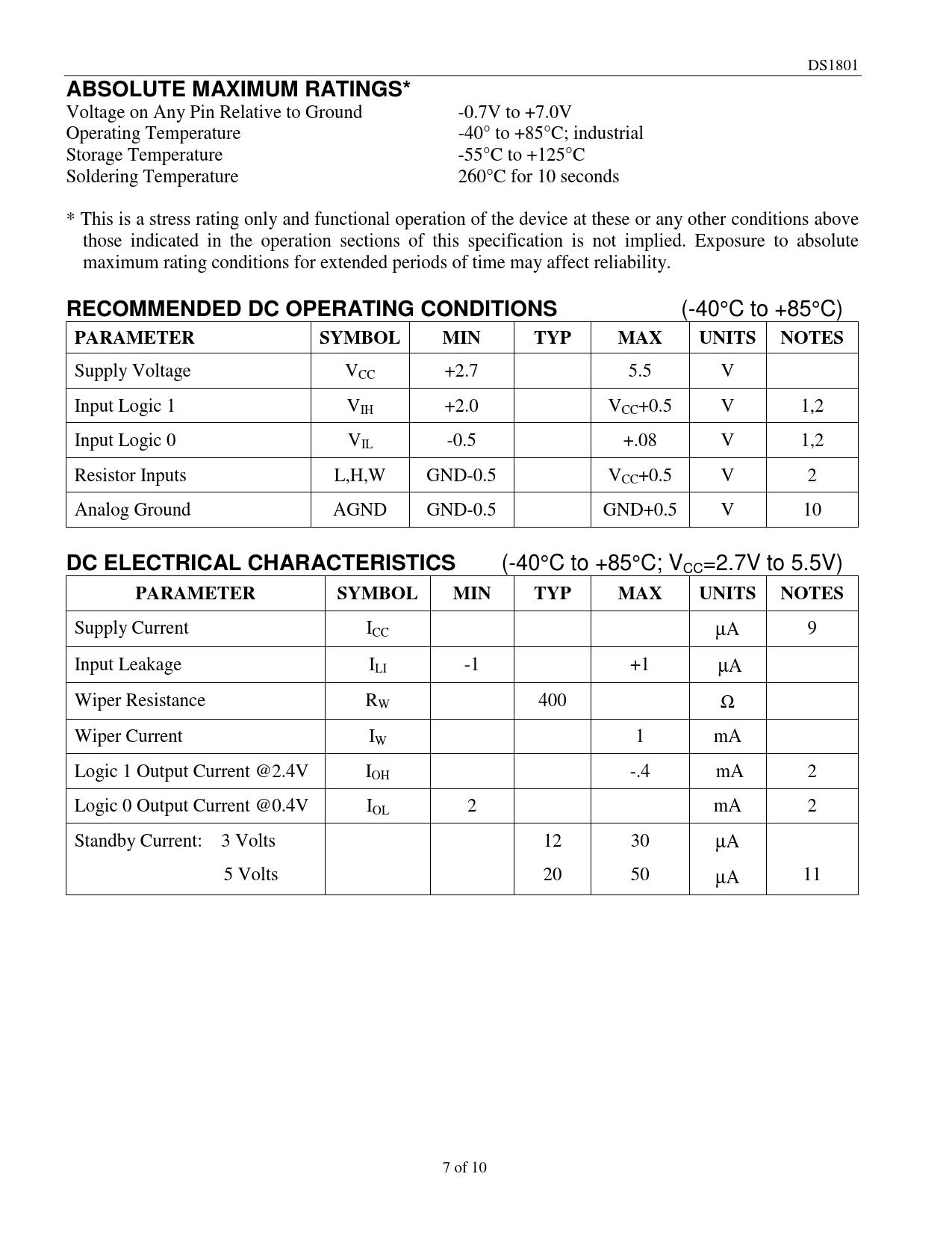 DS1801 ABSOLUTE MAXIMUM RATINGS* Voltage on Any Pin Relative to Ground -0.7V to +7.0V Operating Temperature -40° to +85°C; industrial Storage Temperature -55°C to +125°C Soldering Temperature 260°C for 10 seconds * This is a stress rating only and functional operation of the device at these or any other conditions above those indicated in the operation sections of this specification is not implied. Exposure to absolute maximum rating conditions for extended periods of time may affect reliability. RECOMMENDED DC OPERATING CONDITIONS (-40°C to +85°C) PARAMETERSYMBOLMINTYPMAXUNITSNOTES Supply Voltage VCC +2.7 5.5 V Input Logic 1 VIH +2.0 VCC+0.5 V 1,2 Input Logic 0 VIL -0.5 +.08 V 1,2 Resistor Inputs L,H,W GND-0.5 VCC+0.5 V 2 Analog Ground AGND GND-0.5 GND+0.5 V 10 DC ELECTRICAL CHARACTERISTICS (-40°C to +85°C; VCC=2.7V to 5.5V) PARAMETERSYMBOLMINTYPMAXUNITSNOTES Supply Current ICC µA 9 Input Leakage ILI -1 +1 µA Wiper Resistance RW 400 Ω Wiper Current IW 1 mA Logic 1 Output Current @2.4V IOH -.4 mA 2 Logic 0 Output Current @0.4V IOL 2 mA 2 Standby Current: 3 Volts 12 30 µA 5 Volts 20 50 µA 11 7 of 10