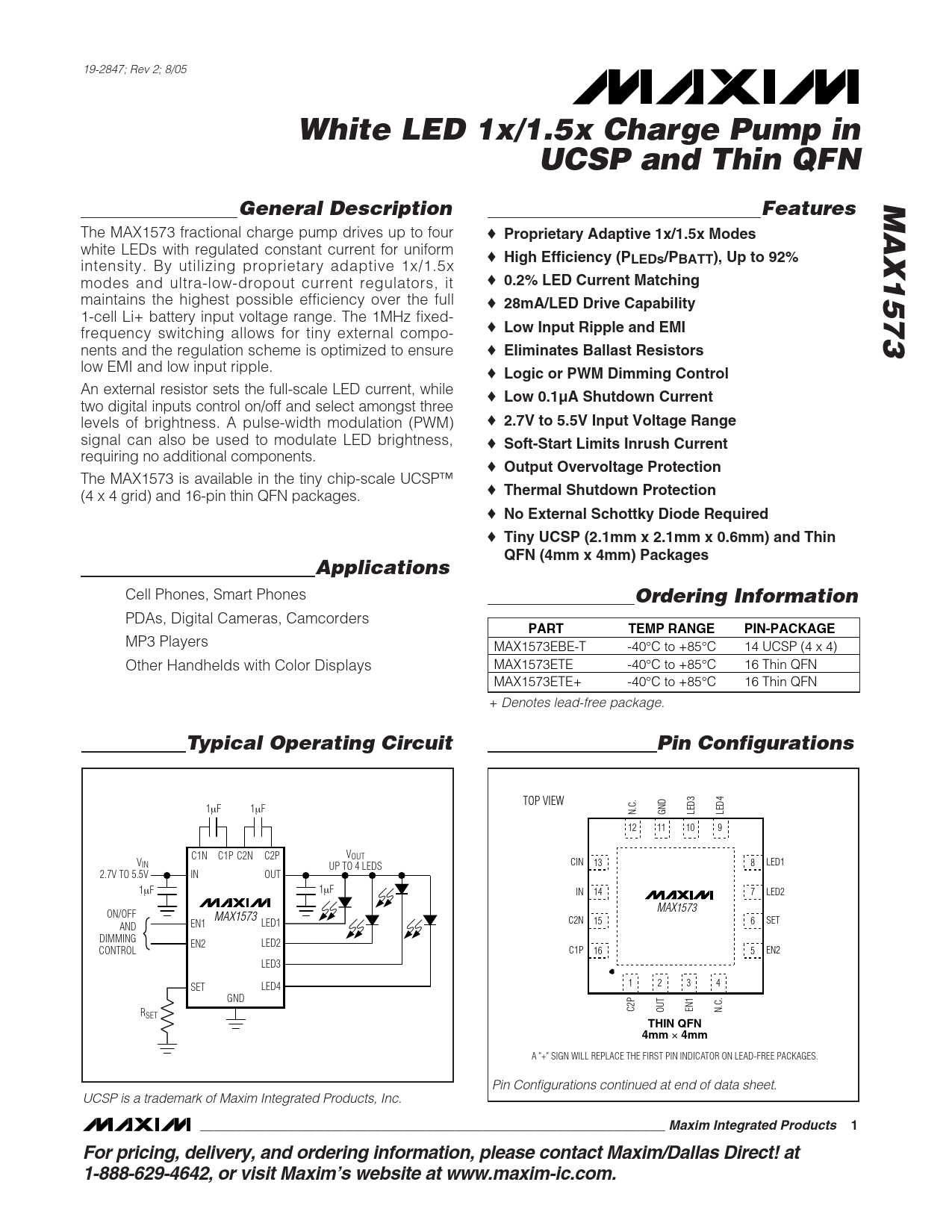 MP3 Players MAX1573EBE-T -40°C to +85°C 14 UCSP (4 x 4) Other Handhelds with Color Displays MAX1573ETE -40°C to +85°C 16 Thin QFN MAX1573ETE+ -40°C to +85°C 16 Thin QFN + Denotes lead-free package.