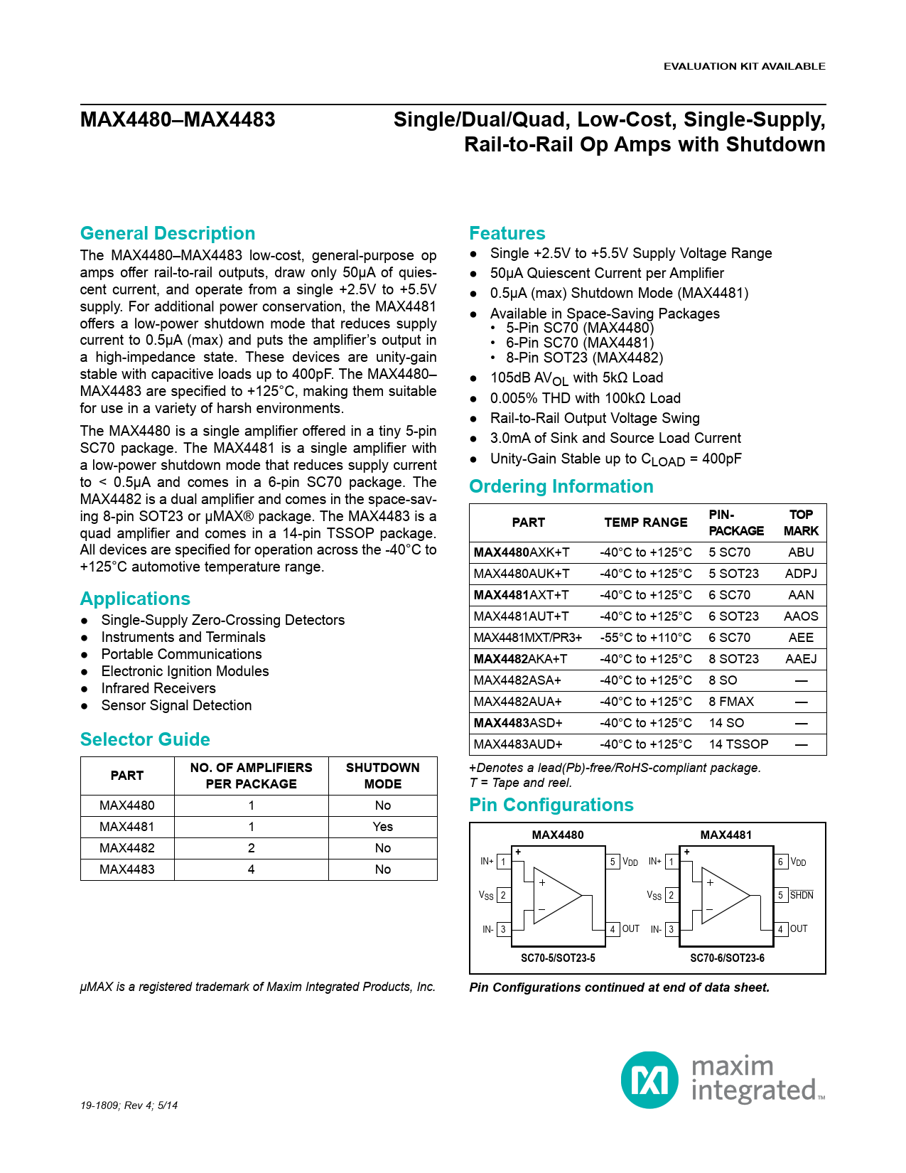 EVALUATION KIT AVAILABLEMAX4480–MAX4483Single/Dual/Quad, Low-Cost, Single-Supply,Rail-to-Rail Op Amps with ShutdownGeneral DescriptionFeatures The MAX4480–MAX4483 low-cost, general-purpose op ● Single +2.5V to +5.5V Supply Voltage Range amps offer rail-to-rail outputs, draw only 50μA of quies- ● 50μA Quiescent Current per Amplifier cent current, and operate from a single +2.5V to +5.5V ● 0.5μA (max) Shutdown Mode (MAX4481) supply. For additional power conservation, the MAX4481 ● Available in Space-Saving Packages offers a low-power shutdown mode that reduces supply • 5-Pin SC70 (MAX4480) current to 0.5μA (max) and puts the amplifier’s output in • 6-Pin SC70 (MAX4481) a high-impedance state. These devices are unity-gain • 8-Pin SOT23 (MAX4482) stable with capacitive loads up to 400pF. The MAX4480– ● 105dB AVOL with 5kΩ Load MAX4483 are specified to +125°C, making them suitable ● 0.005% THD with 100kΩ Load for use in a variety of harsh environments. ● Rail-to-Rail Output Voltage Swing The MAX4480 is a single amplifier offered in a tiny 5-pin ● 3.0mA of Sink and Source Load Current SC70 package. The MAX4481 is a single amplifier with a low-power shutdown mode that reduces supply current ● Unity-Gain Stable up to CLOAD = 400pF to < 0.5μA and comes in a 6-pin SC70 package. The Ordering Information MAX4482 is a dual amplifier and comes in the space-sav- ing 8-pin SOT23 or μMAX® package. The MAX4483 is a PARTTEMP RANGEPIN-TOP quad amplifier and comes in a 14-pin TSSOP package. PACKAGEMARK All devices are specified for operation across the -40°C to MAX4480 AXK+T -40°C to +125°C 5 SC70 ABU +125°C automotive temperature range. MAX4480AUK+T -40°C to +125°C 5 SOT23 ADPJ ApplicationsMAX4481 AXT+T -40°C to +125°C 6 SC70 AAN ● Single-Supply Zero-Crossing Detectors MAX4481AUT+T -40°C to +125°C 6 SOT23 AAOS ● Instruments and Terminals MAX4481MXT/PR3+ -55°C to +110°C 6 SC70 AEE ● Portable Communications MAX4482 AKA+T -40°C to +125°C 8 SOT23 AAEJ ● Electronic Ignition Modules ● Infrared Receivers MAX4482ASA+ -40°C to +125°C 8 SO — ● Sensor Signal Detection MAX4482AUA+ -40°C to +125°C 8 FMAX — MAX4483 ASD+ -40°C to +125°C 14 SO — Selector Guide MAX4483AUD+ -40°C to +125°C 14 TSSOP — SHUTDOWN +Denotes a lead(Pb)-free/RoHS-compliant package. PARTNO. OF AMPLIFIERSPER PACKAGEMODE T = Tape and reel. MAX4480 1 No Pin Configurations MAX4481 1 Yes MAX4480MAX4481 MAX4482 2 No ++ IN+ 1 5 V IN+ 1 6 V MAX4483 4 No DD DD VSS 2 VSS 2 5 SHDN IN- 3 4 OUT IN- 3 4 OUT SC70-5/SOT23-5SC70-6/SOT23-6 μMAX is a registered trademark of Maxim Integrated Products, Inc. Pin Configurations continued at end of data sheet. 19-1809; Rev 4; 5/14