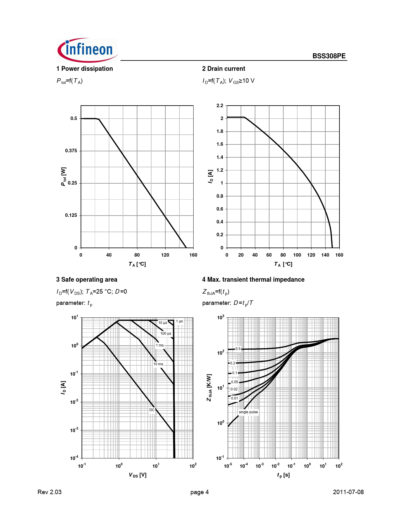 BSS308PE1 Power dissipation2 Drain current P tot=f(T A) I D=f(T A); V GS≥10 V 2.20.521.81.60.3751.41.2[W][A]tot 0.25IDP10.80.60.1250.40.20004080120160020406080100120140160TA [°C]TA[°C]3 Safe operating area4 Max. transient thermal impedance I D=f(V DS); T A=25 °C; D =0 Z thJA=f(t p) parameter: t p parameter: D =t p/T 101103 1 µs 10 µs 100 µs 1 ms 100 0.5 102 10 ms 0.2 10-1 0.1 0.05 [A][K/W]101 0.02 IDAthJ 0.01 Z10-2 DC single pulse 10010-310-410-110210110010-110210110010-110-210-310-410-5VDS [V]tp [s] Rev 2.03 page 4 2011-07-08