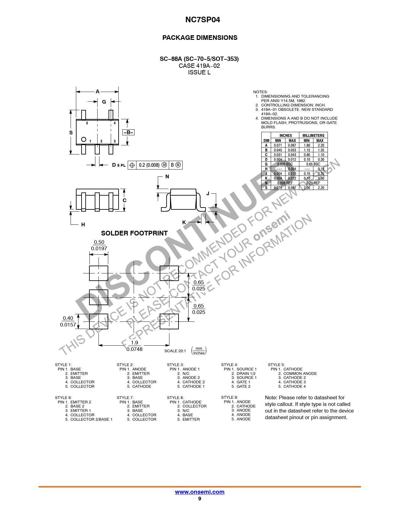 NC7SP04. PACKAGE DIMENSIONS. SC−88A (SC−70−5/SOT−353). −B−. INCHES. MILLIMETERS. DIM. MIN. MAX. D 5 PL. SOLDER FOOTPRINT. www.onsemi.com