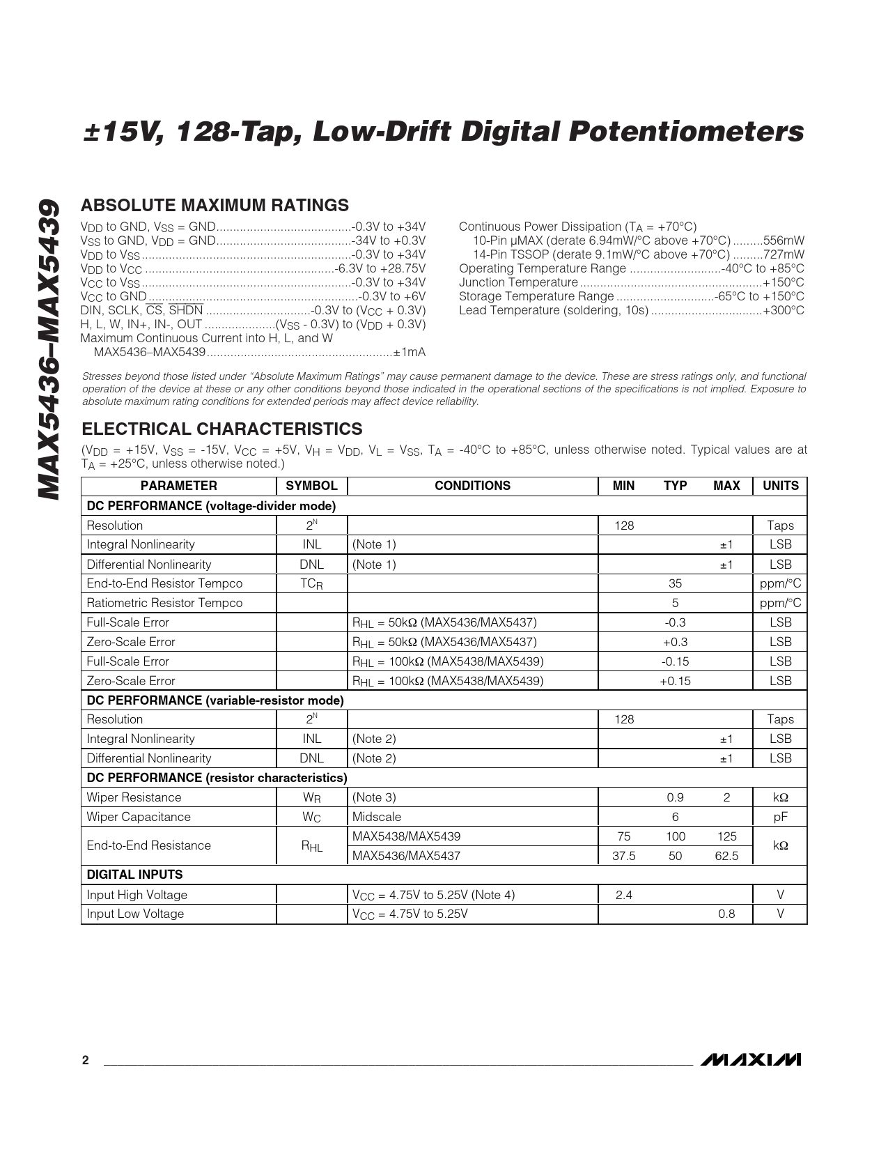Pages / Page11 / 2 — ±15V, 128-Tap, Low-Drift Digital Potentiometers. ABSOLUTE MAXIMUM …