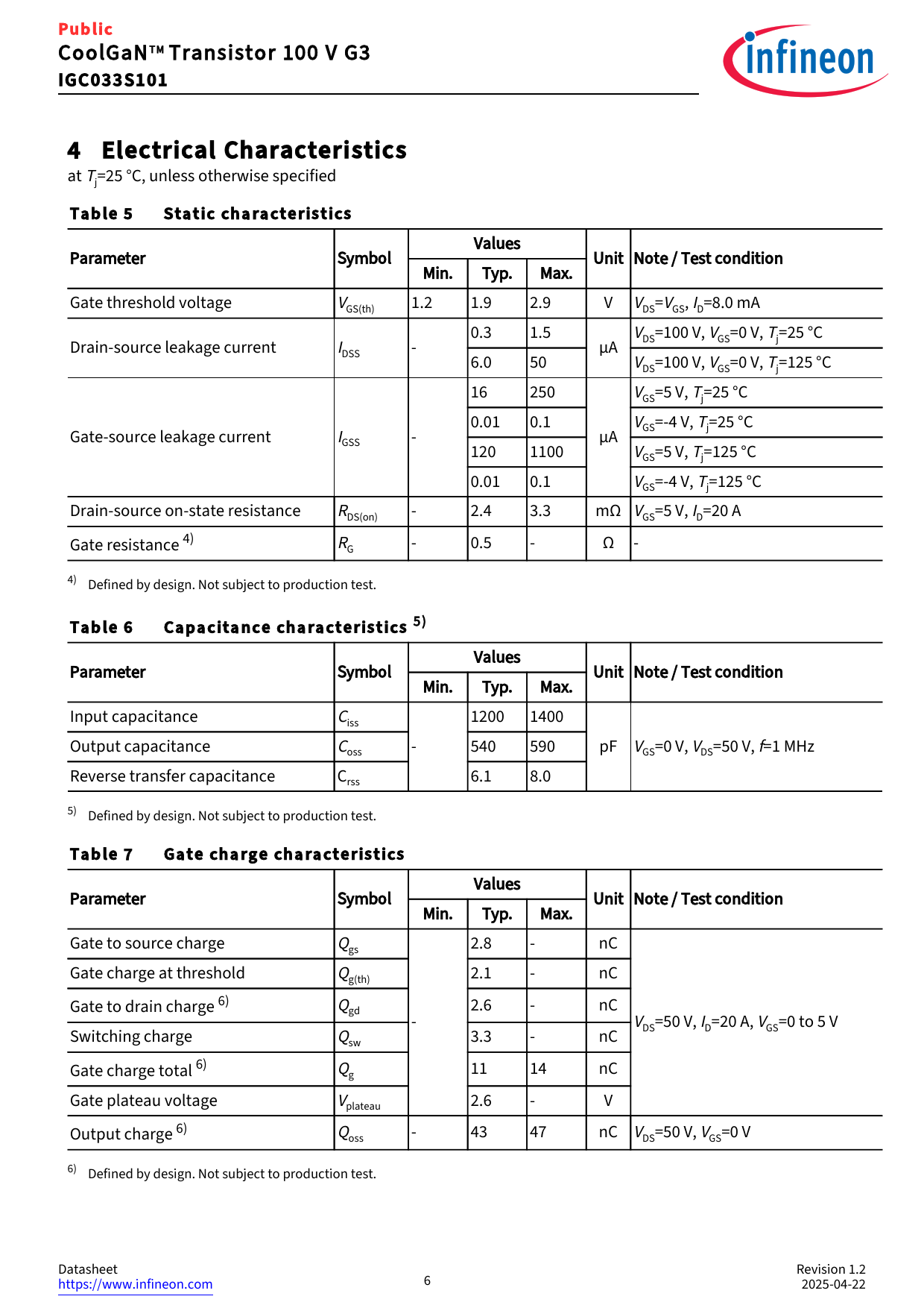 link to page 6 link to page 6 link to page 6 link to page 6 link to page 6 Public CoolGaNT MTransistor 100 V G3 IGC033S1014 Electrical Characteristics at Tj=25 °C, unless otherwise specified Table 5 Static characteristics Values Parameter Symbol Unit Note / Test condition Min. Typ. Max. Gate threshold voltage VGS(th) 1.2 1.9 2.9 V VDS=VGS, I =8.0 mA D 0.3 1.5 VDS=100 V, VGS=0 V, Tj=25 °C Drain‑source leakage current IDSS ‑ μA 6.0 50 VDS=100 V, VGS=0 V, Tj=125 °C 16 250 VGS=5 V, Tj=25 °C 0.01 0.1 VGS=‑4 V, Tj=25 °C Gate‑source leakage current IGSS ‑ μA 120 1100 VGS=5 V, Tj=125 °C 0.01 0.1 VGS=‑4 V, Tj=125 °C Drain‑source on‑state resistance RDS(on) ‑ 2.4 3.3 mΩ VGS=5 V, I =20 A D Gate resistance 4) RG ‑ 0.5 ‑ Ω ‑ 4) Defined by design. Not subject to production test. Table 6 Capacitance characteristics 5) Values Parameter Symbol Unit Note / Test condition Min. Typ. Max. Input capacitance Ciss 1200 1400 Output capacitance Coss ‑ 540 590 pF VGS=0 V, VDS=50 V, f=1 MHz Reverse transfer capacitance Crss 6.1 8.0 5) Defined by design. Not subject to production test. Table 7 Gate charge characteristics Values Parameter Symbol Unit Note / Test condition Min. Typ. Max. Gate to source charge Qgs 2.8 ‑ nC Gate charge at threshold Qg(th) 2.1 ‑ nC Gate to drain charge 6) Qgd 2.6 ‑ nC ‑ VDS=50 V, I =20 A, D VGS=0 to 5 V Switching charge Qsw 3.3 ‑ nC Gate charge total 6) Qg 11 14 nC Gate plateau voltage Vplateau 2.6 ‑ V Output charge 6) Qoss ‑ 43 47 nC VDS=50 V, VGS=0 V 6) Defined by design. Not subject to production test. Datasheet Revision 1.2 https://www.infineon.com 6 2025‑04‑22 Document Outline Description Maximum ratings Recommended operating conditions Thermal characteristics Electrical Characteristics Electrical characteristics diagrams Package outlines Appendix A Revision history Trademarks Disclaimer