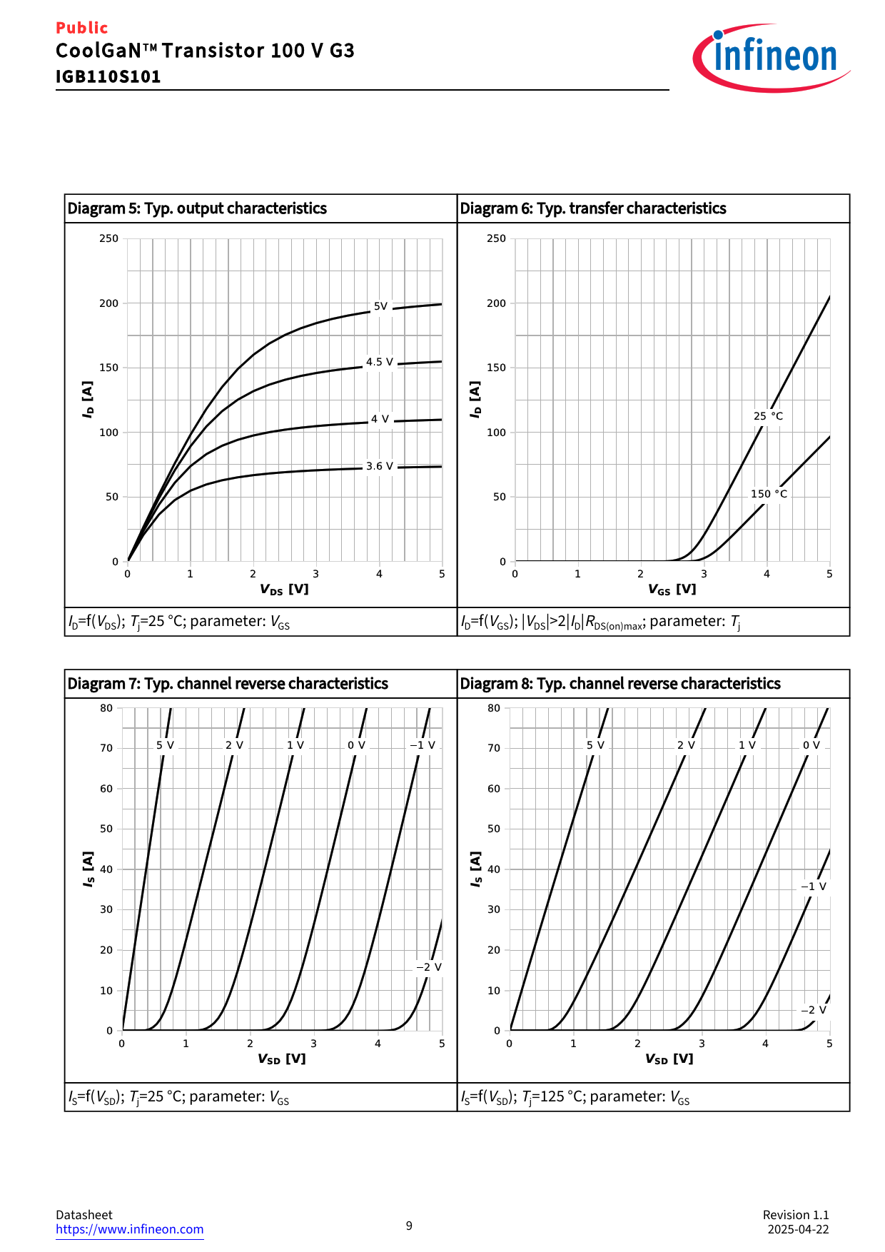 IS=f(VSD); Tj=25 °C; parameter: VGS IS=f(VSD); Tj=125 °C; parameter: VGS Datasheet Revision 1.1 https://www.infineon.com 9 2025‑04‑22 Document Outline Description Maximum ratings Recommended operating conditions Thermal characteristics Electrical Characteristics Electrical characteristics diagrams Package outlines Appendix A Revision history Trademarks Disclaimer
