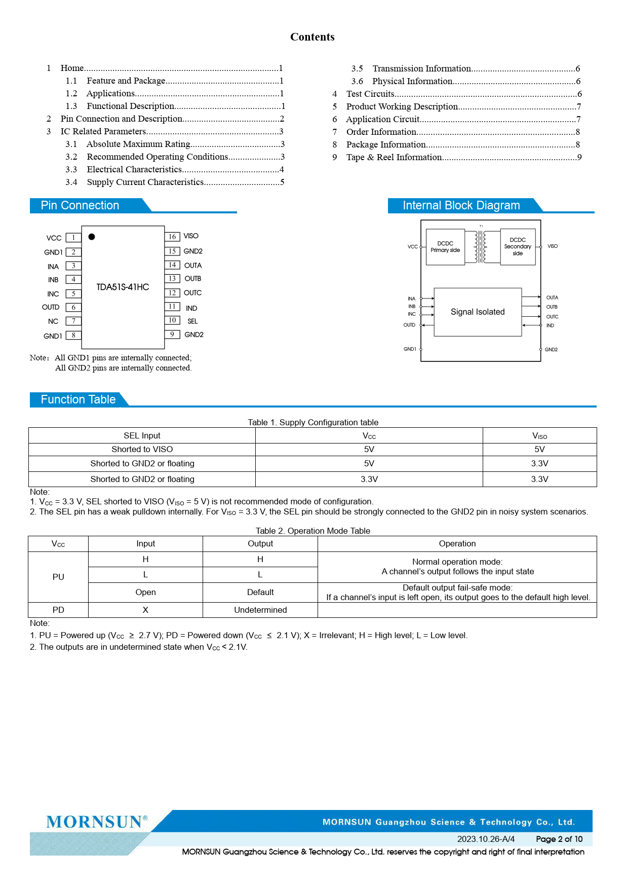 1 Home. 1 3.5 Transmission Information. 6 1.1 Feature and Package. 1 3.6 Physical Information. 6 1.2 Applications. .1 4 Test Circuits. .6 1.3 Functional Description. .1 5 Product Working Description. 7 2 Pin Connection and Description. .2 6 Application Circuit. 7 3 IC Related Parameters.. .3 7 Order Information. .8 3.1 Absolute Maximum Rating. 3 8 Package Information. .8 3.2 Recommended Operating Conditions. 3 9 Tape & Reel Information. .9 3.3 Electrical Characteristics. .4 3.4 Supply Current Characteristics. 5 Pin Connection Internal Block Diagram Note:All GND1 pins are internally connected; All GND2 pins are internally connected. Function Table Table 1. Supply Configuration table SEL Input VCC VISO Shorted to VISO 5V 5V Shorted to GND2 or floating 5V 3.3V Shorted to GND2 or floating 3.3V 3.3V Note: 1. VCC = 3.3 V, SEL shorted to VISO (VISO = 5 V) is not recommended mode of configuration. 2. The SEL pin has a weak pul down internal y. For VISO = 3.3 V, the SEL pin should be strongly connected to the GND2 pin in noisy system scenarios. Table 2. Operation Mode Table VCC Input Output Operation H H Normal operation mode: PU A channel’s output fol ows the input state L L Open Default Default output fail-safe mode: If a channel’s input is left open, its output goes to the default high level. PD X Undetermined Note: 1. PU = Powered up (VCC ≥ 2.7 V); PD = Powered down (VCC ≤ 2.1 V); X = Irrelevant; H = High level; L = Low level. 2. The outputs are in undetermined state when VCC < 2.1V. 2023.10.26-A/4