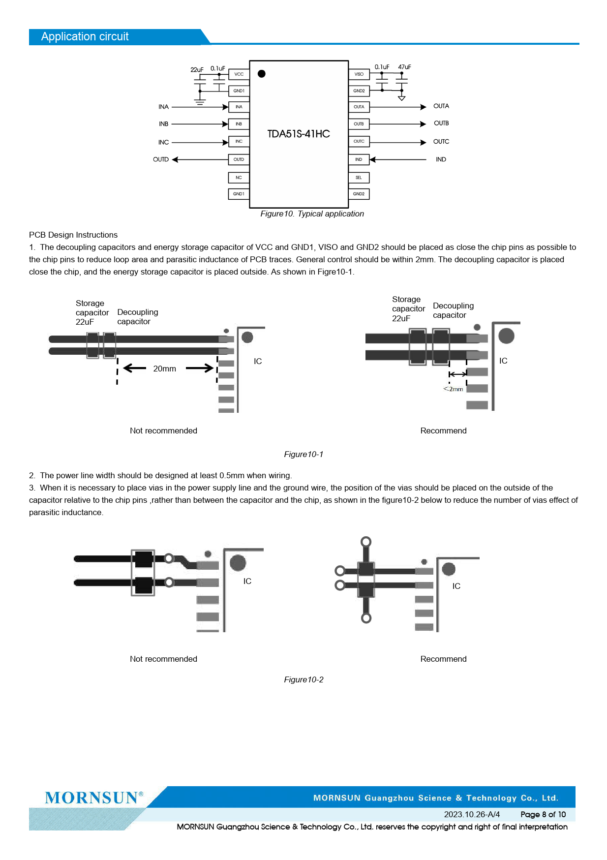 Application circuit Figure10. Typical application PCB Design Instructions 1. The decoupling capacitors and energy storage capacitor of VCC and GND1, VISO and GND2 should be placed as close the chip pins as possible to the chip pins to reduce loop area and parasitic inductance of PCB traces. General control should be within 2mm. The decoupling capacitor is placed close the chip, and the energy storage capacitor is placed outside. As shown in Figre10-1. Storage Storage capacitor Decoupling capacitor Decoupling 22uF capacitor 22uF capacitor IC IC 20mm Not recommended Recommend Figure10-1 2. The power line width should be designed at least 0.5mm when wiring. 3. When it is necessary to place vias in the power supply line and the ground wire, the position of the vias should be placed on the outside of the capacitor relative to the chip pins ,rather than between the capacitor and the chip, as shown in the figure10-2 below to reduce the number of vias effect of parasitic inductance. IC IC Not recommended Recommend Figure10-2 2023.10.26-A/4