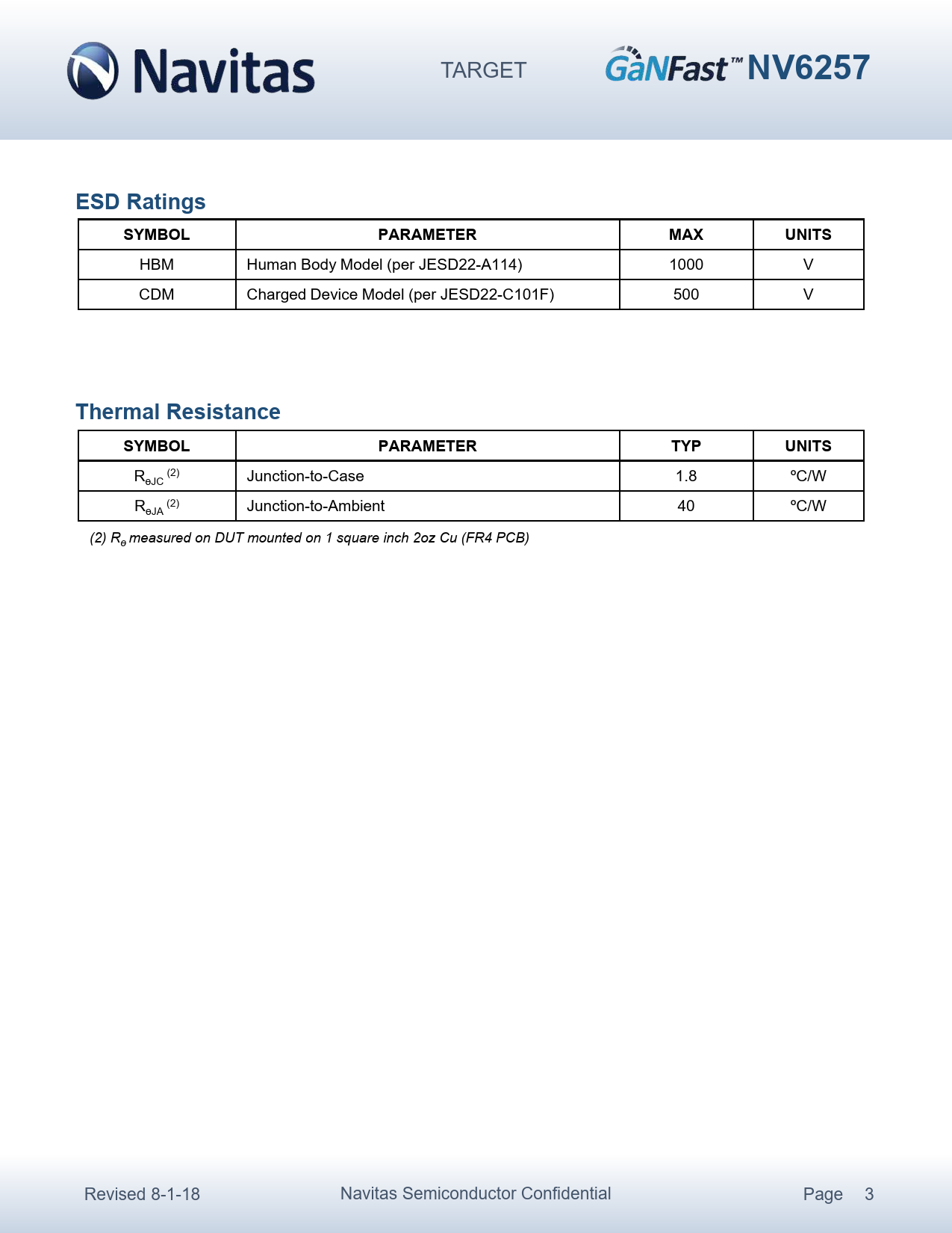 TARGET NV6257ESD RatingsSYMBOLPARAMETERMAXUNITS HBM Human Body Model (per JESD22-A114) 1000 V CDM Charged Device Model (per JESD22-C101F) 500 V Thermal ResistanceSYMBOLPARAMETERTYPUNITS R (2) Junction-to-Case 1.8 ºC/W ɵJC R (2) Junction-to-Ambient 40 ºC/W ɵJA (2) Rɵ measured on DUT mounted on 1 square inch 2oz Cu (FR4 PCB) Revised 8-1-18 Navitas Semiconductor Confidential Page 3