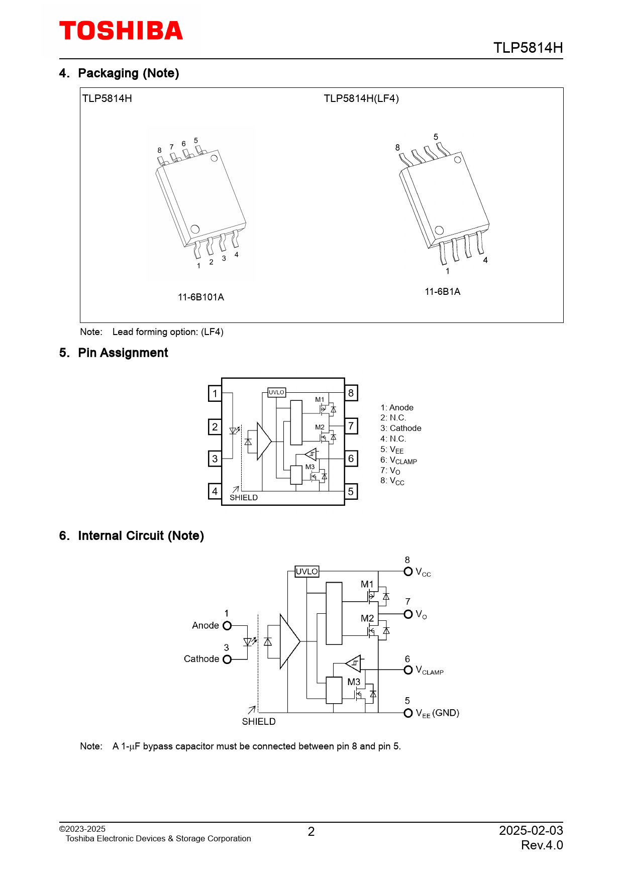 TLP5814H 4. Packaging (Note) TLP5814H TLP5814H(LF4) 11-6B1A 11-6B101A Note: Lead forming option: (LF4) 5. Pin Assignment 1: Anode 2: N.C. 3: Cathode 4: N.C. 5: VEE 6: VCLAMP 7: VO 8: VCC 6. Internal Circuit (Note) Note: A 1-µF bypass capacitor must be connected between pin 8 and pin 5. ©2023-2025 2 2025-02-03 Toshiba Electronic Devices & Storage Corporation Rev.4.0