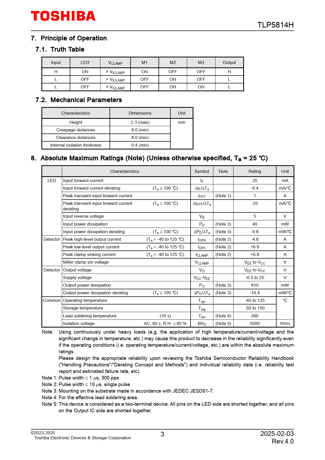 Model Line for this Datasheet Text Version of Document TLP5814H 7. Principle of Operation 7.1. Truth Table Input LED VCLAMP M1 M2 M3 Output H ON > VtCLAMP ON OFF OFF H L OFF > VtCLAMP OFF ON OFF L L OFF < VtCLAMP OFF ON ON L 7.2. Mechanical Parameters Characteristics Dimensions Unit Height 2.3 (max) mm Creepage distances 8.0 (min) Clearance distances 8.0 (min) Internal isolation thickness 0.4 (min) 8. Absolute Maximum Ratings (Note) (Unless otherwise specified, Ta = 25 �) Characteristics Symbol Note Rating Unit LED Input forward current IF 25 mA Input forward current derating (Ta ≥ 100 �) ∆IF/∆Ta -0.4 mA/� Peak transient input forward current IFPT (Note 1) 1 A Peak transient input forward current (Ta ≥ 100 �) ∆IFPT/∆Ta -25 mA/� derating Input reverse voltage VR 5 V Input power dissipation PD (Note 3) 40 mW Input power dissipation derating (Ta ≥ 100 �) ∆PD/∆Ta (Note 3) -0.8 mW/� Detector Peak high-level output current (Ta = -40 to 125 �) IOPH (Note 2) -4.8 A Peak low-level output current (Ta = -40 to 125 �) IOPL (Note 2) +6.8 A Peak clamp sinking current (Ta = -40 to 125 �) ICLAMP (Note 2) +6.8 A Miller clamp pin voltage VCLAMP VEE to VCC V Detector Output voltage VO VEE to VCC V Supply voltage VCC-VEE -0.5 to 25 V Output power dissipation PO (Note 3) 810 mW Output power dissipation derating (Ta ≥ 100 �) ∆PO/∆Ta (Note 3) -10.4 mW/� Common Operating temperature Topr -40 to 125 � Storage temperature Tstg -55 to 150 Lead soldering temperature (10 s) Tsol (Note 4) 260 Isolation voltage AC, 60 s, R.H. ≤ 60 % BVS (Note 5) 5000 Vrms Note: Using continuously under heavy loads (e.g. the application of high temperature/current/voltage and the significant change in temperature, etc.) may cause this product to decrease in the reliability significantly even if the operating conditions (i.e. operating temperature/current/voltage, etc.) are within the absolute maximum ratings. Please design the appropriate reliability upon reviewing the Toshiba Semiconductor Reliability Handbook ("Handling Precautions"/"Derating Concept and Methods") and individual reliability data (i.e. reliability test report and estimated failure rate, etc). Note 1: Pulse width ≤ 1 µs, 300 pps Note 2: Pulse width ≤ 10 µs, single pulse Note 3: Mounting on the substrate made in accordance with JEDEC JESD51-7. Note 4: For the effective lead soldering area. Note 5: This device is considered as a two-terminal device: All pins on the LED side are shorted together, and all pins on the Output IC side are shorted together. ©2023-2025 3 2025-02-03 Toshiba Electronic Devices & Storage Corporation Rev.4.0