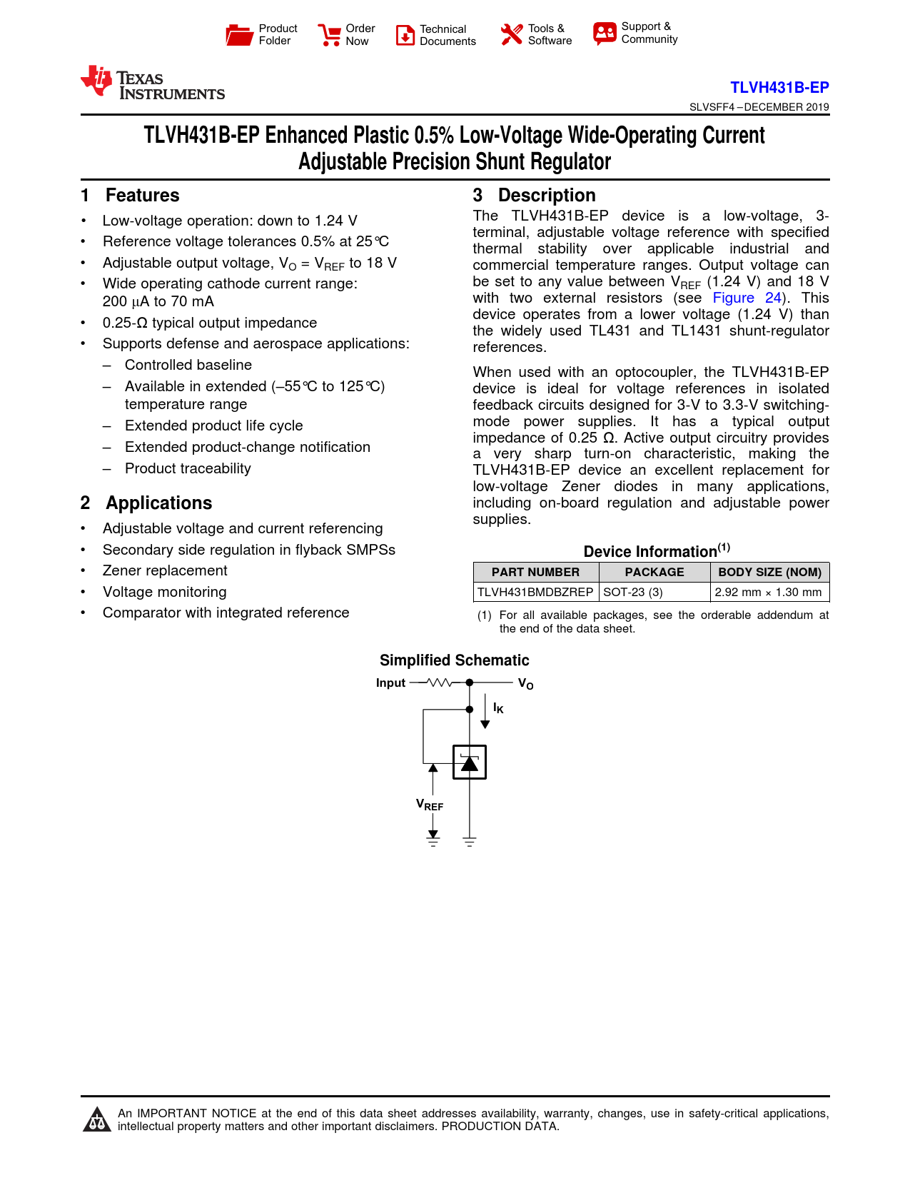 link to page 11 link to page 1 Product Order Technical Tools & Support & Folder Now Documents Software Community TLVH431B-EP SLVSFF4 – DECEMBER 2019 TLVH431B-EP Enhanced Plastic 0.5% Low-Voltage Wide-Operating CurrentAdjustable Precision Shunt Regulator1 Features3 Description • Low-voltage operation: down to 1.24 V The TLVH431B-EP device is a low-voltage, 3- 1 terminal, adjustable voltage reference with specified • Reference voltage tolerances 0.5% at 25°C thermal stability over applicable industrial and • Adjustable output voltage, VO = VREF to 18 V commercial temperature ranges. Output voltage can • Wide operating cathode current range: be set to any value between VREF (1.24 V) and 18 V 200 μA to 70 mA with two external resistors (see Figure 24). This device operates from a lower voltage (1.24 V) than • 0.25-Ω typical output impedance the widely used TL431 and TL1431 shunt-regulator • Supports defense and aerospace applications: references. – Controlled baseline When used with an optocoupler, the TLVH431B-EP – Available in extended (–55°C to 125°C) device is ideal for voltage references in isolated temperature range feedback circuits designed for 3-V to 3.3-V switching- – Extended product life cycle mode power supplies. It has a typical output impedance of 0.25 Ω. Active output circuitry provides – Extended product-change notification a very sharp turn-on characteristic, making the – Product traceability TLVH431B-EP device an excellent replacement for low-voltage Zener diodes in many applications, 2 Applications including on-board regulation and adjustable power supplies. • Adjustable voltage and current referencing • Secondary side regulation in flyback SMPSs Device Information(1) • Zener replacement PART NUMBERPACKAGEBODY SIZE (NOM) • Voltage monitoring TLVH431BMDBZREP SOT-23 (3) 2.92 mm × 1.30 mm • Comparator with integrated reference (1) For all available packages, see the orderable addendum at the end of the data sheet. Simplified SchematicInputVOIKVREF 1 An IMPORTANT NOTICE at the end of this data sheet addresses availability, warranty, changes, use in safety-critical applications, intellectual property matters and other important disclaimers. PRODUCTION DATA. Document Outline 1 Features 2 Applications 3 Description Table of Contents 4 Revision History 5 Pin Configuration and Functions 6 Specifications 6.1 Absolute Maximum Ratings 6.2 ESD Ratings 6.3 Recommended Operating Conditions 6.4 Thermal Information 6.5 Electrical Characteristics 6.6 Typical Characteristics 7 Parameter Measurement Information 8 Detailed Description 8.1 Overview 8.2 Functional Block Diagram 8.3 Feature Description 8.4 Device Functional Modes 8.4.1 Open Loop (Comparator) 8.4.2 Closed Loop 9 Applications and Implementation 9.1 Application Information 9.2 Typical Applications 9.2.1 Comparator With Integrated Reference (Open Loop) 9.2.1.1 Design Requirements 9.2.1.2 Detailed Design Procedure 9.2.1.3 Application Curves 9.2.2 Shunt Regulator/Reference 9.2.2.1 Design Requirements 9.2.2.2 Detailed Design Procedure 9.2.2.3 Application Curve 10 Power Supply Recommendations 11 Layout 11.1 Layout Guidelines 11.2 Layout Example 12 Device and Documentation Support 12.1 Documentation Support 12.1.1 Related Documentation 12.2 Receiving Notification of Documentation Updates 12.3 Support Resources 12.4 Trademarks 12.5 Electrostatic Discharge Caution 12.6 Glossary 13 Mechanical, Packaging, and Orderable Information