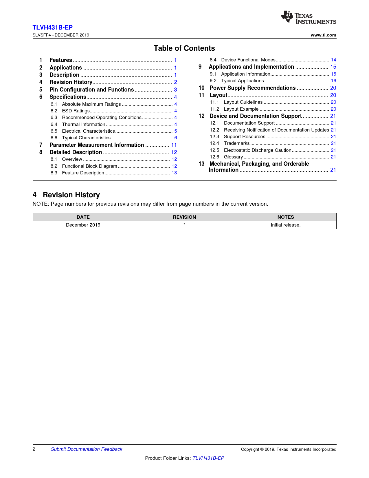 | Pages / Page | 29 / 2 — TLVH431B-EP. www.ti.com. Table of Contents. Features. Applications. … |