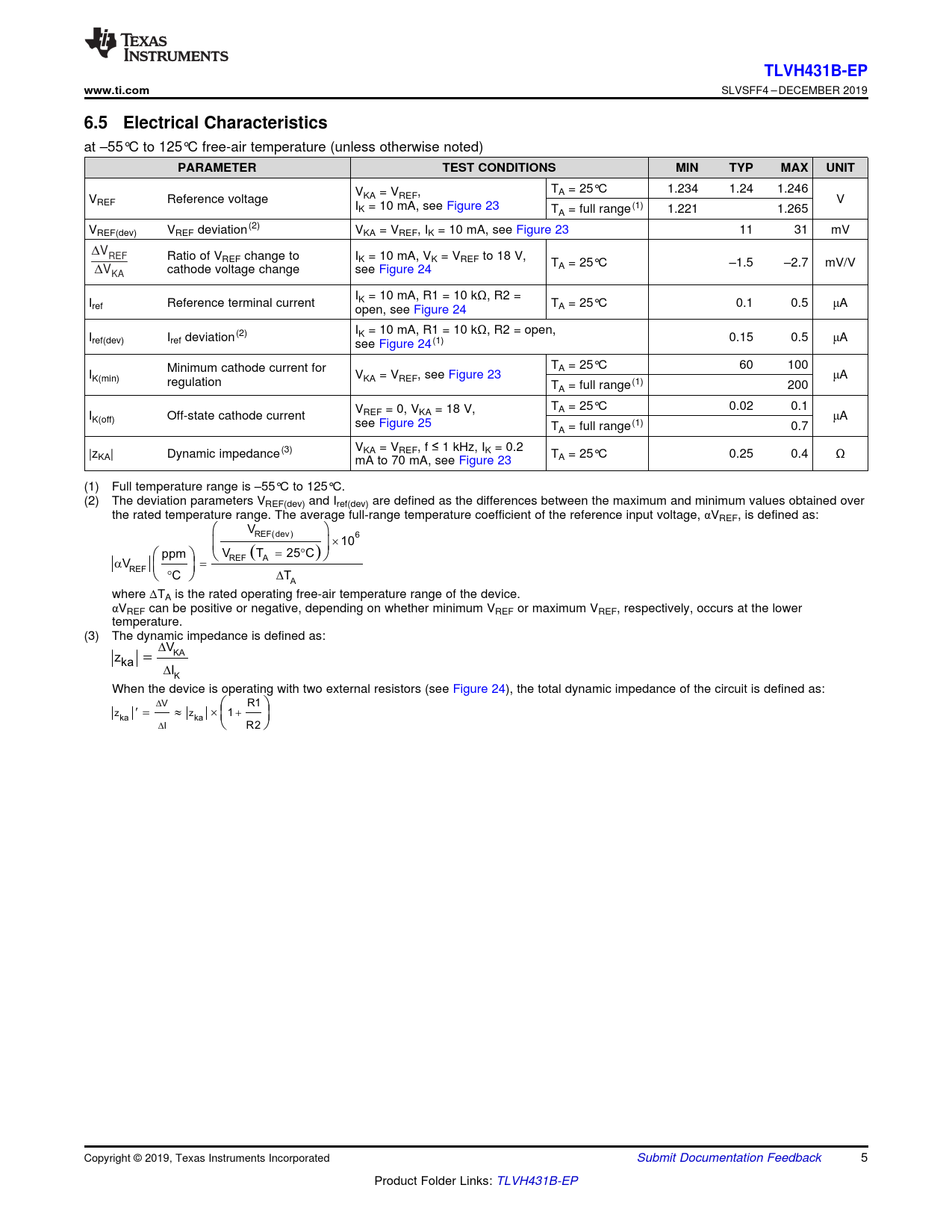 TLVH431B-EP. www.ti.com. 6.5 Electrical Characteristics. PARAMETER. TEST CONDITIONS. MIN. TYP. MAX. UNIT