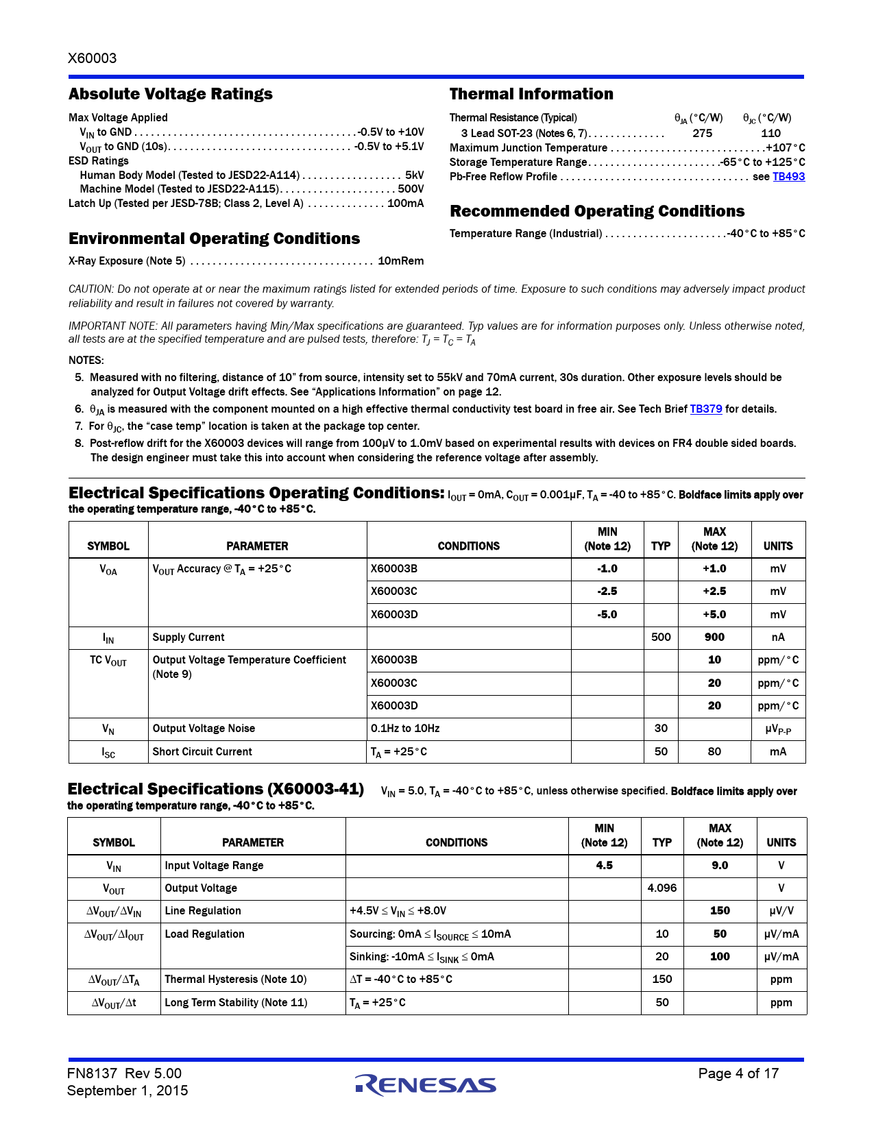 link to page 5 link to page 5 link to page 5 link to page 4 link to page 4 link to page 4 link to page 5 link to page 5 link to page 5 link to page 5 link to page 12 X60003 Absolute Voltage Ratings Thermal Information Max Voltage Applied Thermal Resistance (Typical) JA (°C/W) JC (°C/W) VIN to GND . -0.5V to +10V 3 Lead SOT-23 (Notes 6, 7). 275 110 VOUT to GND (10s). -0.5V to +5.1V Maximum Junction Temperature . .+107°C ESD Ratings Storage Temperature Range. .-65°C to +125°C Human Body Model (Tested to JESD22-A114) . 5kV Pb-Free Reflow Profile . see TB493 Machine Model (Tested to JESD22-A115). 500V Latch Up (Tested per JESD-78B; Class 2, Level A) . 100mA Recommended Operating Conditions Environmental Operating Conditions Temperature Range (Industrial) . -40°C to +85°C X-Ray Exposure (Note 5) . 10mRem CAUTION: Do not operate at or near the maximum ratings listed for extended periods of time. Exposure to such conditions may adversely impact product reliability and result in failures not covered by warranty. IMPORTANT NOTE: All parameters having Min/Max specifications are guaranteed. Typ values are for information purposes only. Unless otherwise noted, all tests are at the specified temperature and are pulsed tests, therefore: TJ = TC = TA NOTES: 5. Measured with no filtering, distance of 10” from source, intensity set to 55kV and 70mA current, 30s duration. Other exposure levels should be analyzed for Output Voltage drift effects. See “Applications Information” on page 12. 6. JA is measured with the component mounted on a high effective thermal conductivity test board in free air. See Tech Brief TB379 for details. 7. For JC, the “case temp” location is taken at the package top center. 8. Post-reflow drift for the X60003 devices will range from 100µV to 1.0mV based on experimental results with devices on FR4 double sided boards. The design engineer must take this into account when considering the reference voltage after assembly. Electrical Specifications Operating Conditions: IOUT = 0mA, COUT = 0.001µF, TA = -40 to +85°C. Boldface limits apply over the operating temperature range, -40°C to +85°C. MIN MAX SYMBOL PARAMETER CONDITIONS (Note 12) TYP (Note 12) UNITS VOA VOUT Accuracy @ TA = +25°C X60003B -1.0 +1.0 mV X60003C -2.5 +2.5 mV X60003D -5.0 +5.0 mV IIN Supply Current 500 900 nA TC VOUT Output Voltage Temperature Coefficient X60003B 10 ppm/°C (Note 9) X60003C 20 ppm/°C X60003D 20 ppm/°C VN Output Voltage Noise 0.1Hz to 10Hz 30 µVP-P ISC Short Circuit Current TA = +25°C 50 80 mA Electrical Specifications (X60003-41) VIN = 5.0, TA = -40°C to +85°C, unless otherwise specified. Boldface limits apply over the operating temperature range, -40°C to +85°C. MIN MAX SYMBOL PARAMETER CONDITIONS (Note 12) TYP (Note 12) UNITS VIN Input Voltage Range 4.5 9.0 V VOUT Output Voltage 4.096 V VOUT/VIN Line Regulation +4.5V VIN +8.0V 150 µV/V VOUT/IOUT Load Regulation Sourcing: 0mA ISOURCE 10mA 10 50 µV/mA Sinking: -10mA ISINK 0mA 20 100 µV/mA VOUT/TA Thermal Hysteresis (Note 10) T = -40°C to +85°C 150 ppm VOUT/t Long Term Stability (Note 11) TA = +25°C 50 ppm FN8137 Rev 5.00 Page 4 of 17 September 1, 2015