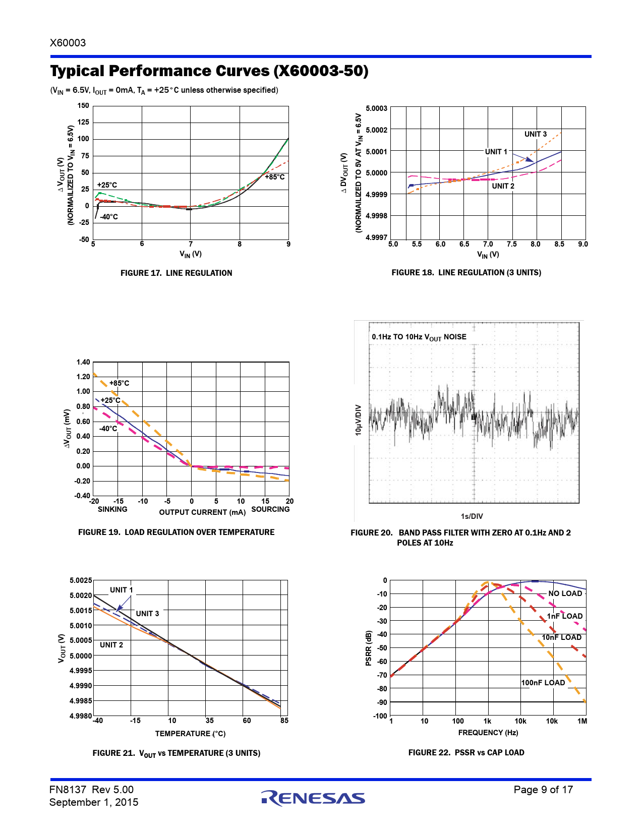 Model Line for this Datasheet Text Version of Document X60003 Typical Performance Curves (X60003-50) (VIN = 6.5V, IOUT = 0mA, TA = +25°C unless otherwise specified)150 5.0003 V ) 125 = 6.5 5.0002 UNIT 3 6.5V 100 IN = V T IN ) 5.0001 75 UNIT 1 A (V (V) O V T T 50 OU O 5V +85°C 5.0000 OU V +25°C V 25 UNIT 2 D 4.9999 ILIZED T 0 A M -40°C R 4.9998 (NORMAILIZED T -25 O (N -50 4.9997 5 6 7 8 9 5.0 5.5 6.0 6.5 7.0 7.5 8.0 8.5 9.0 VIN (V) VIN (V) FIGURE 17. LINE REGULATION FIGURE 18. LINE REGULATION (3 UNITS)0.1Hz TO 10Hz VOUT NOISE 1.40 1.20 +85°C 1.00 +25°C 0.80 IV mV) /D 0.60 ( V -40°C µ 10 OUT 0.40 V 0.20 0.00 -0.20 -0.40-20 -15 -10 -5 0 5 10 15 20 SINKING OUTPUT CURRENT (mA) S O URC ING 1s/DIV FIGURE 19. LOAD REGULATION OVER TEMPERATURE FIGURE 20. BAND PASS FILTER WITH ZERO AT 0.1Hz AND 2 POLES AT 10Hz5.0025 0 UNIT 1 5.0020 -10 NO LOAD 5.0015 -20 UNIT 3 1nF LOAD -30 5.0010 ) V -40 5.0005 10nF LOAD ( dB) ( T UNIT 2 -50 OU 5.0000 RR V PS -60 4.9995 -70 4.9990 100nF LOAD -80 4.9985 -90 4.9980 -100 -40 -15 10 35 60 85 1 10 100 1k 10k 10k 1M TEMPERATURE (°C) FREQUENCY (Hz) FIGURE 21. VOUT vs TEMPERATURE (3 UNITS) FIGURE 22. PSSR vs CAP LOAD FN8137 Rev 5.00 Page 9 of 17 September 1, 2015