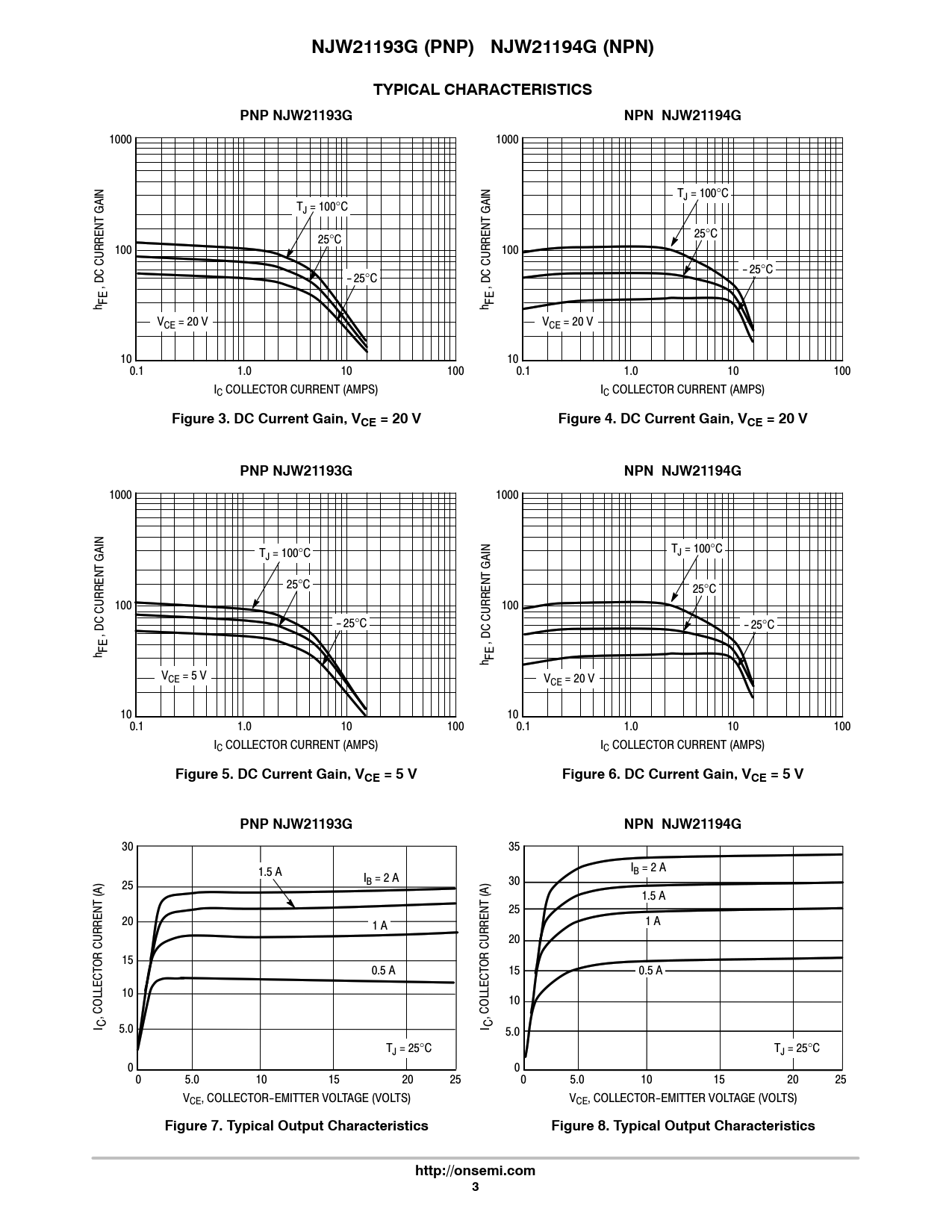NJW21193G (PNP) NJW21194G (NPN)TYPICAL CHARACTERISTICSPNP NJW21193GNPN NJW21194G 1000 1000 TJ = 100°C GAIN TJ = 100°C GAIN 25°C 25°C 100 100 -25°C -25°C , DC CURRENT , DC CURRENT h FE h FE VCE = 20 V VCE = 20 V 10 10 0.1 1.0 10 100 0.1 1.0 10 100 IC COLLECTOR CURRENT (AMPS) IC COLLECTOR CURRENT (AMPS) Figure 3. DC Current Gain, VCE = 20 VFigure 4. DC Current Gain, VCE = 20 VPNP NJW21193GNPN NJW21194G 1000 1000 T TJ = 100°C GAIN J = 100°C GAIN 25°C 25°C 100 100 -25°C -25°C , DC CURRENT , DC CURRENT h FE h FE VCE = 5 V VCE = 20 V 10 10 0.1 1.0 10 100 0.1 1.0 10 100 IC COLLECTOR CURRENT (AMPS) IC COLLECTOR CURRENT (AMPS) Figure 5. DC Current Gain, VCE = 5 VFigure 6. DC Current Gain, VCE = 5 VPNP NJW21193GNPN NJW21194G 30 35 1.5 A IB = 2 A I 25 B = 2 A 30 (A) (A) 1.5 A 25 20 1 A 1 A 20 OR CURRENT 15 OR CURRENT 0.5 A 15 0.5 A 10 10 , COLLECT , COLLECT I C I C 5.0 5.0 TJ = 25°C TJ = 25°C 0 0 0 5.0 10 15 20 25 0 5.0 10 15 20 25 VCE, COLLECTOR-EMITTER VOLTAGE (VOLTS) VCE, COLLECTOR-EMITTER VOLTAGE (VOLTS) Figure 7. Typical Output CharacteristicsFigure 8. Typical Output Characteristicshttp://onsemi.com3