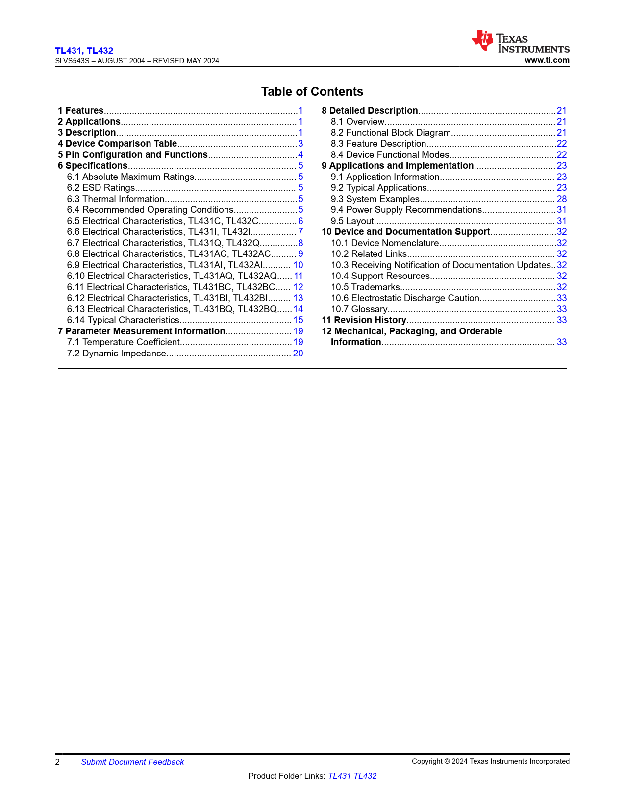 | Pages / Page | 77 / 2 — TL431, TL432. www.ti.com. Table of Contents. 1 Features. 8 Detailed … |