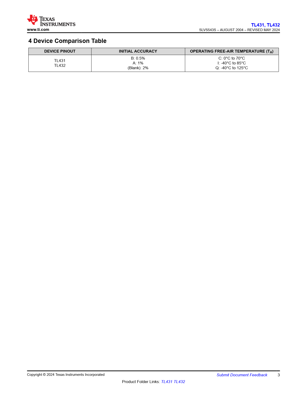 TL431, TL432. www.ti.com. 4 Device Comparison Table. DEVICE PINOUT. INITIAL ACCURACY. OPERATING FREE-AIR TEMPERATURE (TA)