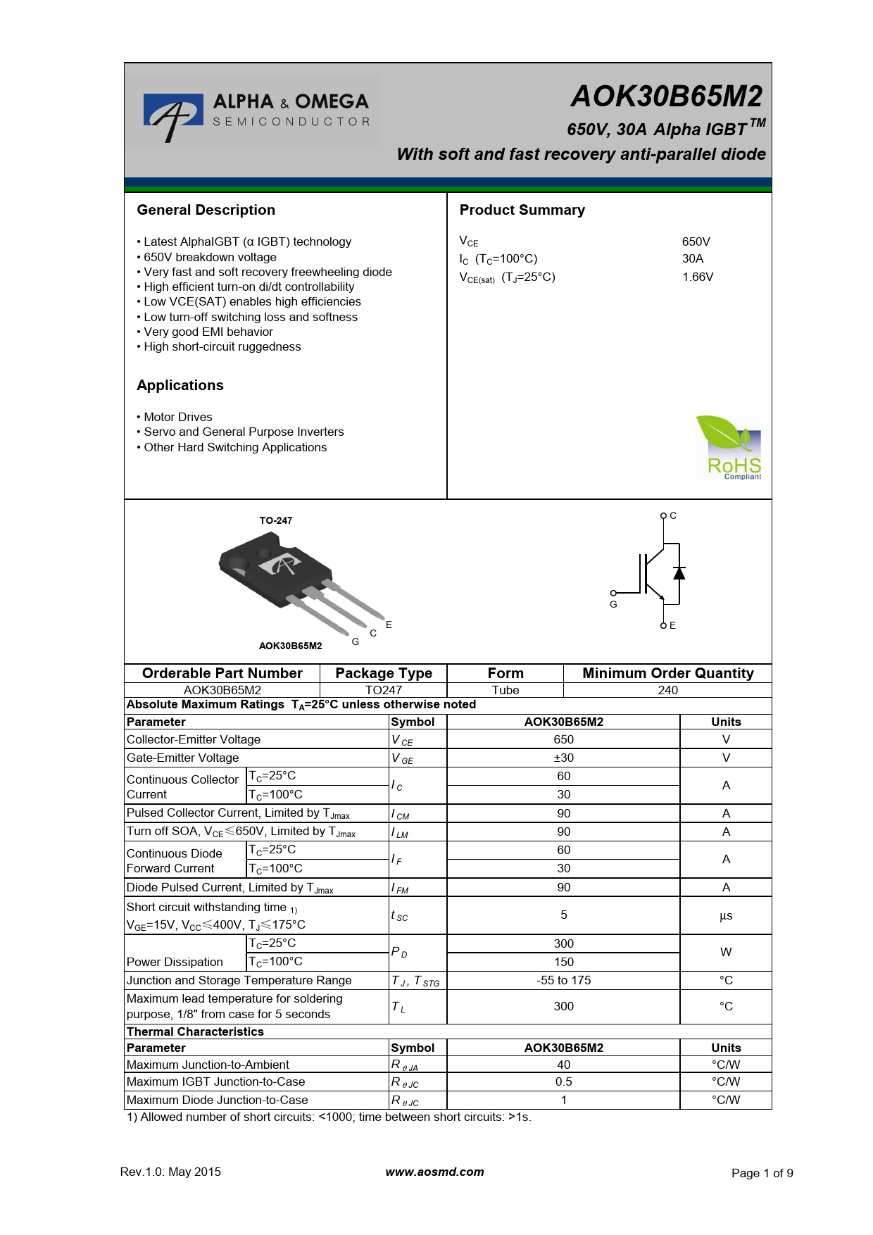 AOK30B65M2 650V, 30A Alpha IGBT TM With soft and fast recovery anti-parallel diode General Description Product Summary