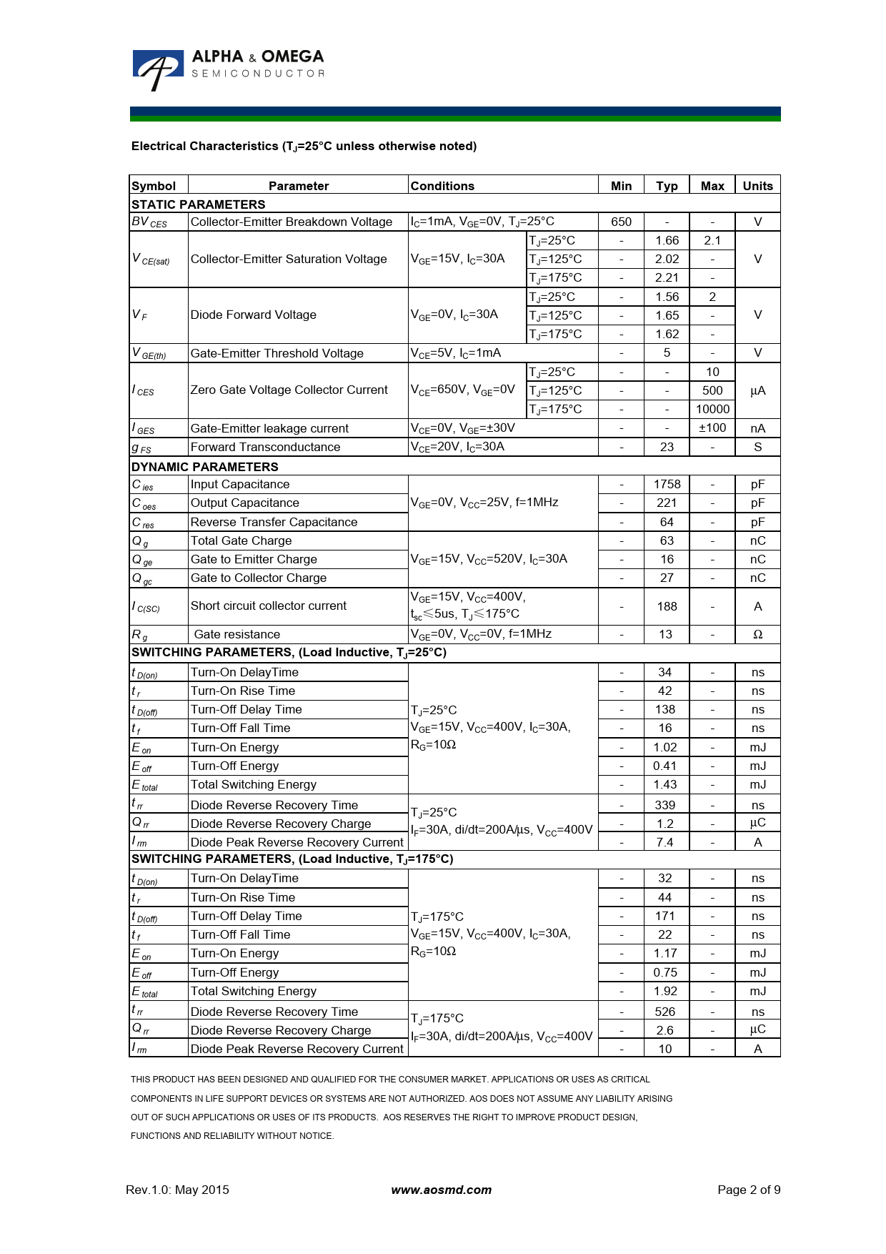 t D(on) Turn-On DelayTime - 32 - ns t r Turn-On Rise Time - 44 - ns t D(off) Turn-Off Delay Time T - 171 - ns J=175°C t Turn-Off Fall Time V f GE=15V, VCC=400V, IC=30A, - 22 - ns E R on Turn-On Energy G=10Ω - 1.17 - mJ E off Turn-Off Energy - 0.75 - mJ E total Total Switching Energy - 1.92 - mJ t rr Diode Reverse Recovery Time - 526 - ns TJ=175°C Q rr Diode Reverse Recovery Charge - 2.6 - µC IF=30A, di/dt=200A/µs, VCC=400V I rm Diode Peak Reverse Recovery Current - 10 - A THIS PRODUCT HAS BEEN DESIGNED AND QUALIFIED FOR THE CONSUMER MARKET. APPLICATIONS OR USES AS CRITICAL COMPONENTS IN LIFE SUPPORT DEVICES OR SYSTEMS ARE NOT AUTHORIZED. AOS DOES NOT ASSUME ANY LIABILITY ARISING OUT OF SUCH APPLICATIONS OR USES OF ITS PRODUCTS. AOS RESERVES THE RIGHT TO IMPROVE PRODUCT DESIGN, FUNCTIONS AND RELIABILITY WITHOUT NOTICE. Rev.1.0: May 2015