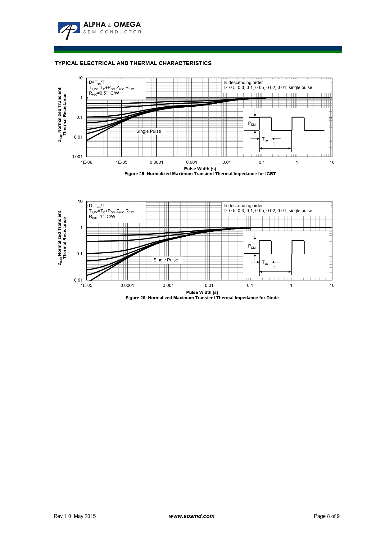 □ TYPICAL ELECTRICAL AND THERMAL CHARACTERISTICS 10 D=T /T on In descending order t T =T +P .Z .R D=0.5, 0.3, 0.1, 0.05, 0.02, 0.01, single pulse n J,PK C DM θJC θJC ie Rθ =0.5 C/W ° se JC c 1 nnrataTisdseelizl R 0.1 aa P rm DM orm eNh Single Pulse CTJ θ 0.01 Z Ton T 0.001 1E-06 1E-05 0.0001 0.001 0.01 0.1 1 10 Pulse Width (s)Figure 25: Normalized Maximum Transient Thermal Impedance for IGBT 10 D=T /T In descending order on t T =T +P .Z .R D=0.5, 0.3, 0.1, 0.05, 0.02, 0.01, single pulse n J,PK C DM θJC θJC ie Rθ =1 C/W ° se JC nc nrata 1 Tisdseeliz al R a P rm DM orm eN 0.1 hCTJ θ Single Pulse Z Ton T 0.01 1E-05 0.0001 0.001 0.01 0.1 1 10 Pulse WiW dth (s)Figure 26: Normalized Maximum Transient Thermal Impedance for Diode Rev.1.0: May 2015 www.aosmd.com Page 8 of 9