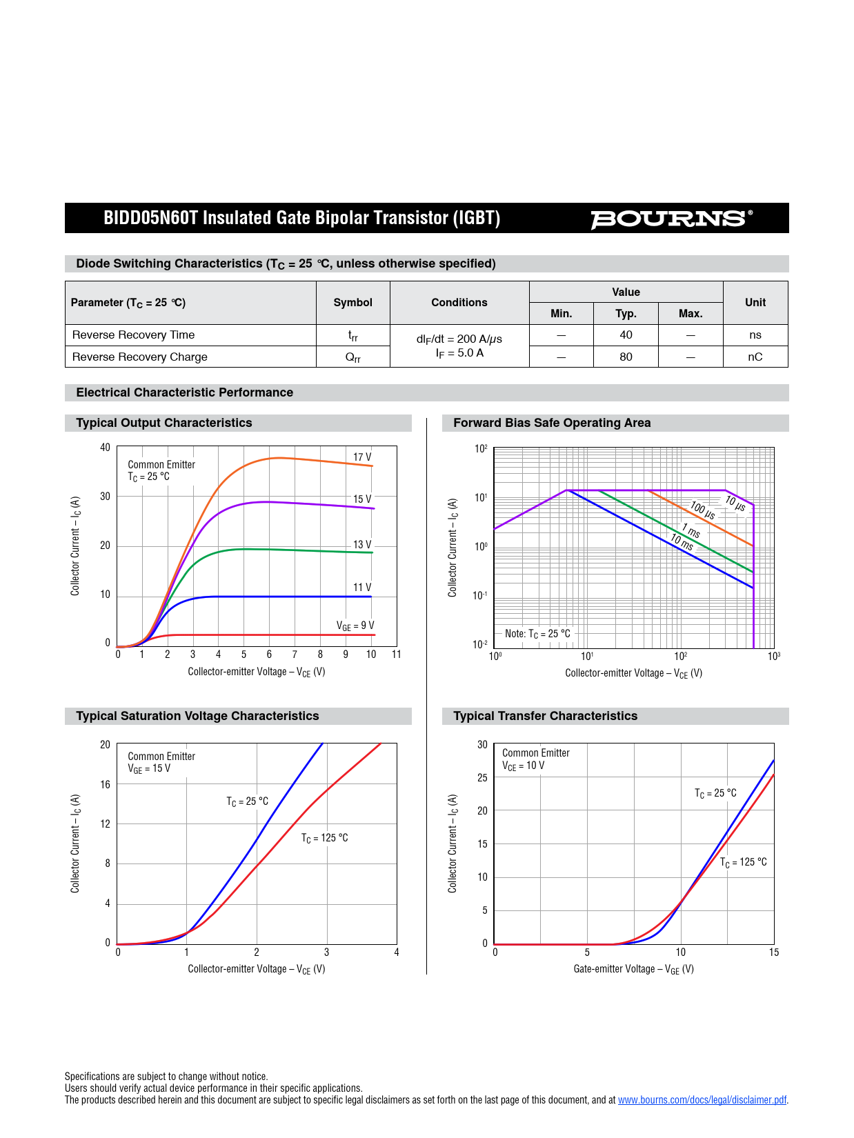 20 30 Common Emitter Common Emitter V V GE = 15 V CE = 10 V 25 16 TC = 25 °C (A) TC = 25 °C (A) C C 20 12 TC = 125 °C 15 8 TC = 125 °C 10 Collector Current – I Collector Current – I 4 5 0 0 0 1 2 3 4 0 5 10 15 Collector-emitter Voltage – VCE (V) Gate-emitter Voltage – VGE (V) Specifications are subject to change without notice. Users should verify actual device performance in their specific applications. The products described herein and this document are subject to specific legal disclaimers as set forth on the last page of this document, and at www.bourns.com/docs/legal/disclaimer.pdf.