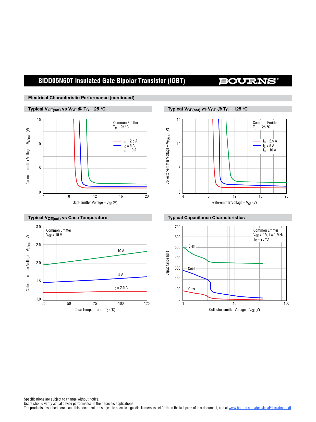 3.0 700 Common Emitter Common Emitter VGE = 15 V V 600 GE = 0 V, f = 1 MHz (V) TC = 25 °C 2.5 Cies CE(sat) 500 10 A 400 2.0 300 Coes 5 A Capacitance (pF) 200 1.5 I Collector-emitter Voltage – V C = 2.5 A 100 Cres 1.0 0 25 50 75 100 125 1 10 100 Case Temperature – TC (°C) Collector-emitter Voltage – VCE (V) Specifications are subject to change without notice. Users should verify actual device performance in their specific applications. The products described herein and this document are subject to specific legal disclaimers as set forth on the last page of this document, and at www.bourns.com/docs/legal/disclaimer.pdf.