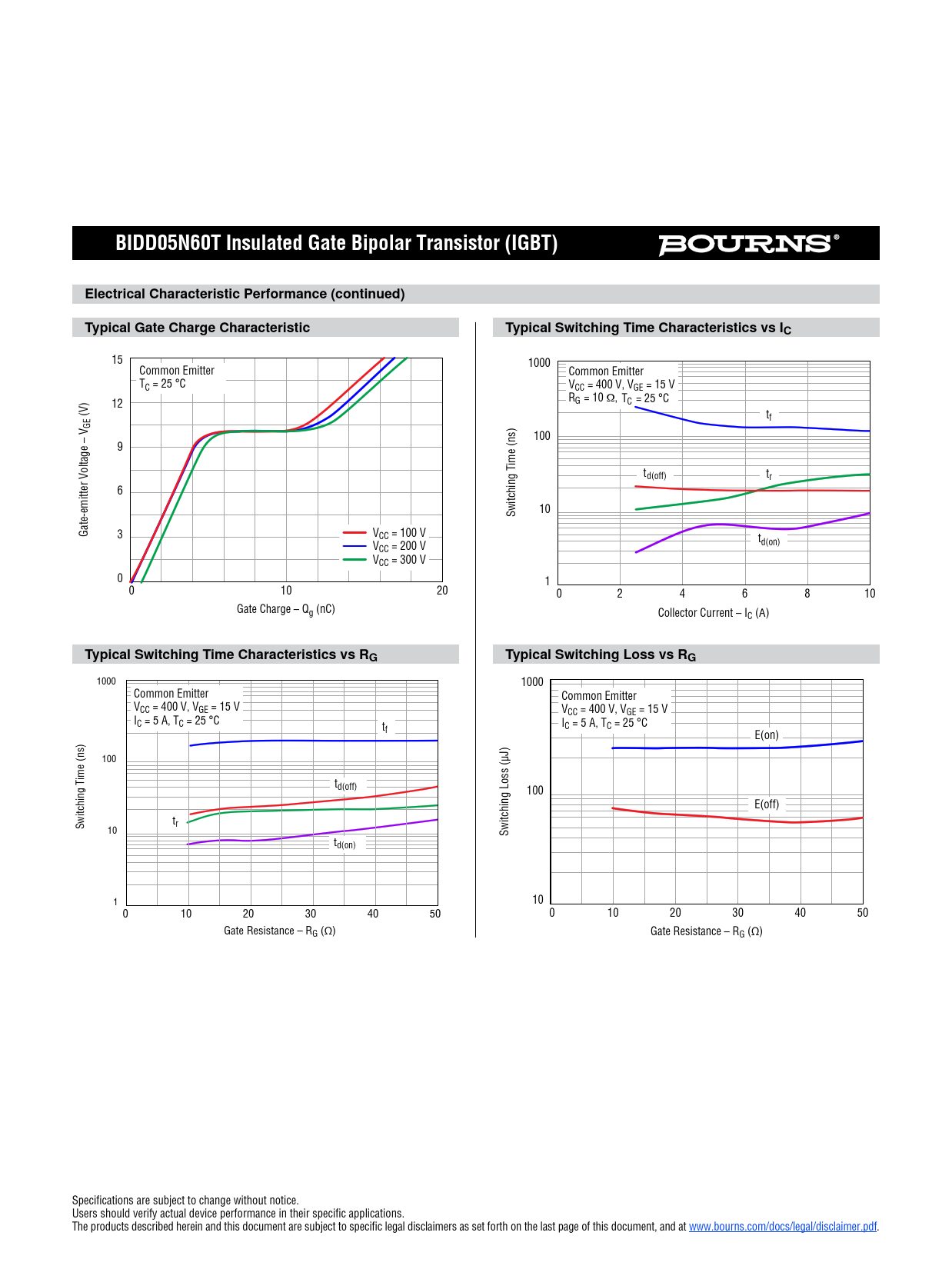 1000 1000 Common Emitter Common Emitter VCC = 400 V, VGE = 15 V VCC = 400 V, VGE = 15 V IC = 5 A, TC = 25 °C I t C = 5 A, TC = 25 °C f E(on) 100 td(off) 100 E(off) Switching Time (ns) tr 10 Switching Loss (µJ) td(on) 1 10 0 10 20 30 40 50 0 10 20 30 40 50 Gate Resistance – RG (Ω) Gate Resistance – RG (Ω) Specifications are subject to change without notice. Users should verify actual device performance in their specific applications. The products described herein and this document are subject to specific legal disclaimers as set forth on the last page of this document, and at www.bourns.com/docs/legal/disclaimer.pdf.