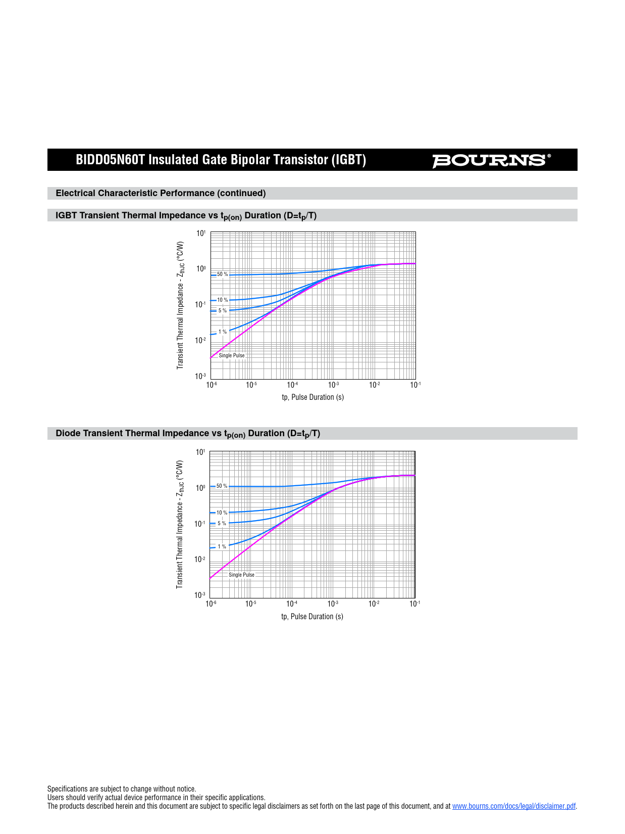 101 (°C/W) 100 50 % thJC 10 % 10-1 5 % 1 % 10-2 Single Pulse Transient Thermal Impedance - Z 10-3 10-6 10-5 10-4 10-3 10-2 10-1 tp, Pulse Duration (s) Specifications are subject to change without notice. Users should verify actual device performance in their specific applications. The products described herein and this document are subject to specific legal disclaimers as set forth on the last page of this document, and at www.bourns.com/docs/legal/disclaimer.pdf.