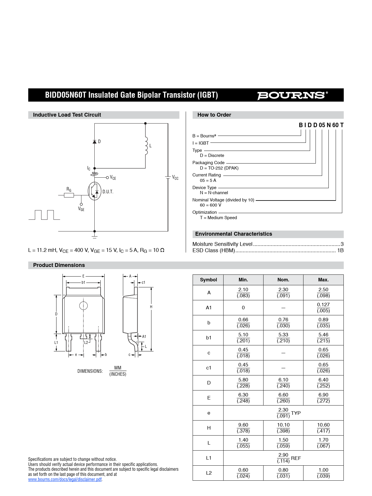 BIDD05N60T Insulated Gate Bipolar Transistor (IGBT)Inductive Load Test CircuitHow to OrderB I D D 05 N 60 T B = Bourns® D I = IGBT L Type D = Discrete Packaging Code IC D = TO-252 (DPAK) V Current Rating CE VCC 05 = 5 A R Device Type G D.U.T. N = N-channel Nominal Voltage (divided by 10) 60 = 600 V VGE Optimization T = Medium Speed Environmental Characteristics Moisture Sensitivity Level ...3 L = 11.2 mH, VCE = 400 V, VGE = 15 V, IC = 5 A, RG = 10 Ω ESD Class (HBM) .. 1B Product Dimensions E A SymbolMin.Nom.Max. b1 c1 2.10 2.30 2.50 A (.083) (.091) (.098) H 0.127 A1 0 — (.005) D 0.66 0.76 0.89 b (.026) (.030) (.035) A1 5.10 5.33 5.46 b1 L1 L2 (.201) (.210) (.215) L 0.45 0.65 e b c c — (.018) (.026) 0.45 0.65 MM c1 — DIMENSIONS: (.018) (.026) (INCHES) 5.80 6.10 6.40 D (.228) (.240) (.252) 6.30 6.60 6.90 E (.248) (.260) (.272) 2.30 e TYP (.091) 9.60 10.10 10.60 H (.378) (.398) (.417) 1.40 1.50 1.70 L (.055) (.059) (.067) 2.90 Specifications are subject to change without notice. L1 REF (.114) Users should verify actual device performance in their specific applications. The products described herein and this document are subject to specific legal disclaimers 0.60 0.80 1.00 as set forth on the last page of this document, and at L2 (.024) (.031) (.039) www.bourns.com/docs/legal/disclaimer.pdf.