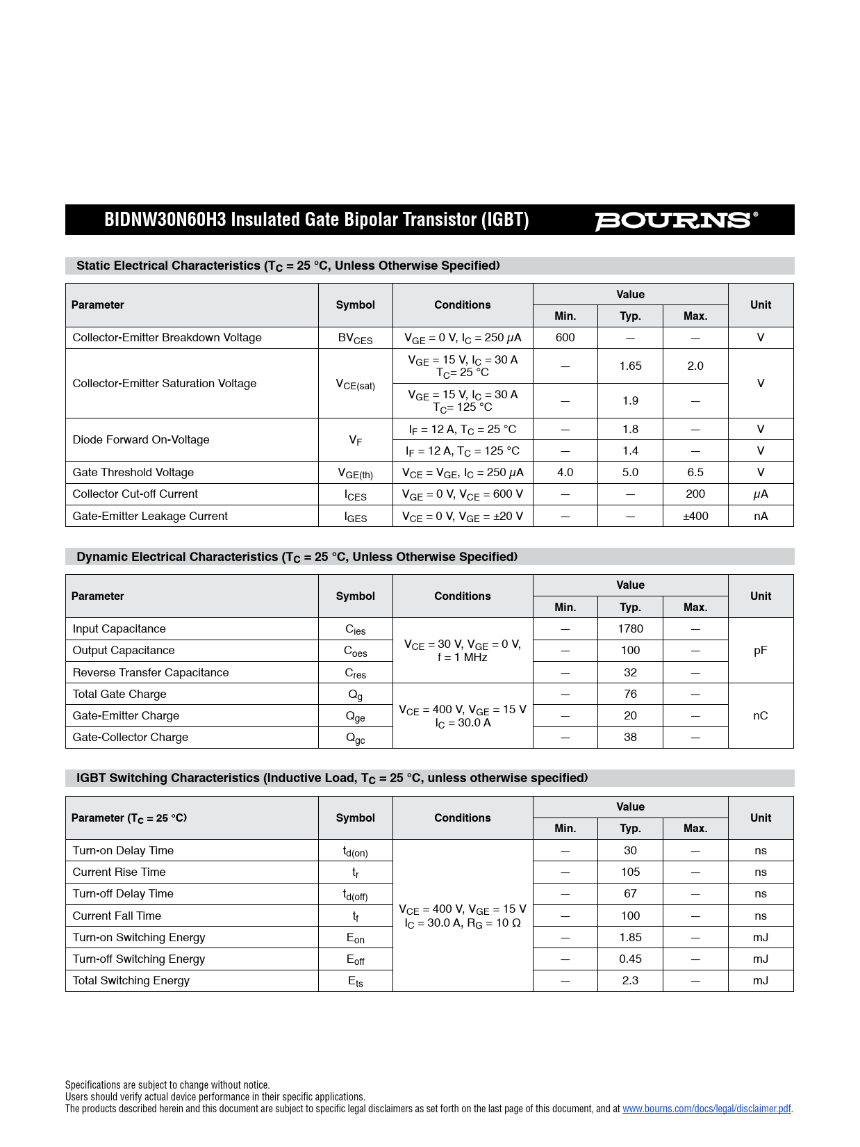 Turn-on Delay Time td(on) — 30 — ns Current Rise Time tr — 105 — ns Turn-off Delay Time td(off) — 67 — ns VCE = 400 V, VGE = 15 V Current Fall Time tf I — 100 — ns C = 30.0 A, RG = 10 Ω Turn-on Switching Energy Eon — 1.85 — mJ Turn-off Switching Energy Eoff — 0.45 — mJ Total Switching Energy Ets — 2.3 — mJ Specifications are subject to change without notice. Users should verify actual device performance in their specific applications. The products described herein and this document are subject to specific legal disclaimers as set forth on the last page of this document, and at www.bourns.com/docs/legal/disclaimer.pdf.