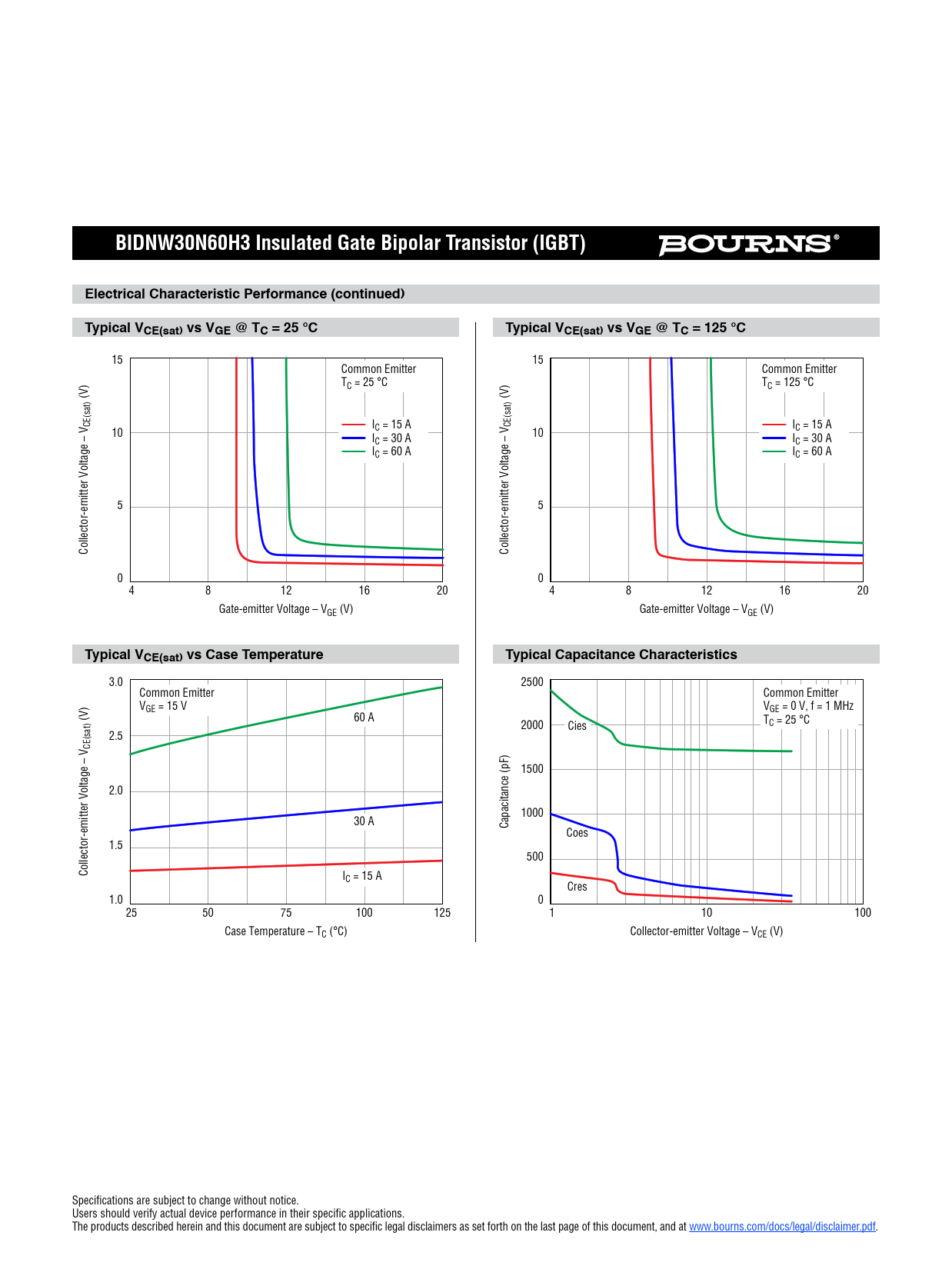 BIDNW30N60H3 Insulated Gate Bipolar Transistor (IGBT)Electrical Characteristic Performance (continued)Typical VCE(sat) vs VGE @ TC = 25 °CTypical VCE(sat) vs VGE @ TC = 125 °C 15 15 Common Emitter Common Emitter TC = 25 °C TC = 125 °C (V) (V) CE(sat) I CE(sat) I 10 C = 15 A C = 15 A I 10 C = 30 A IC = 30 A IC = 60 A IC = 60 A 5 5 Collector-emitter Voltage – V Collector-emitter Voltage – V 0 0 4 8 12 16 20 4 8 12 16 20 Gate-emitter Voltage – VGE (V) Gate-emitter Voltage – VGE (V) Typical VCE(sat) vs Case TemperatureTypical Capacitance Characteristics 3.0 2500 Common Emitter Common Emitter VGE = 15 V VGE = 0 V, f = 1 MHz (V) 60 A 2000 TC = 25 °C Cies 2.5 CE(sat) 1500 2.0 1000 30 A Capacitance (pF) Coes 1.5 500 Collector-emitter Voltage – V IC = 15 A Cres 1.0 0 25 50 75 100 125 1 10 100 Case Temperature – TC (°C) Collector-emitter Voltage – VCE (V) Specifications are subject to change without notice. Users should verify actual device performance in their specific applications. The products described herein and this document are subject to specific legal disclaimers as set forth on the last page of this document, and at www.bourns.com/docs/legal/disclaimer.pdf.