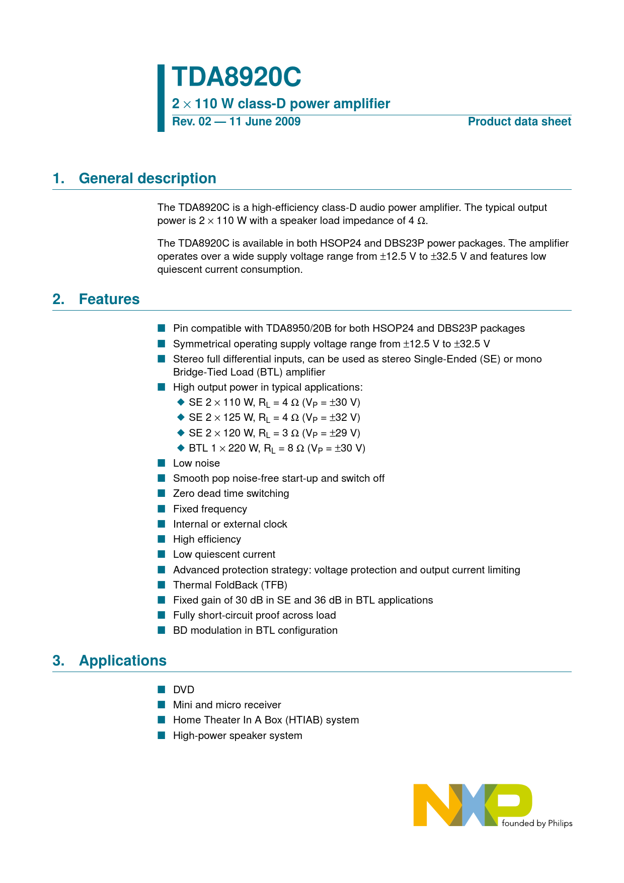TDA8920C 2 × 110 W class-D power amplifier Rev. 02 — 11 June 2009Product data sheet1.General description The TDA8920C is a high-efficiency class-D audio power amplifier. The typical output power is 2 × 110 W with a speaker load impedance of 4 Ω. The TDA8920C is available in both HSOP24 and DBS23P power packages. The amplifier operates over a wide supply voltage range from ±12.5 V to ±32.5 V and features low quiescent current consumption. 2.Features n Pin compatible with TDA8950/20B for both HSOP24 and DBS23P packages n Symmetrical operating supply voltage range from ±12.5 V to ±32.5 V n Stereo full differential inputs, can be used as stereo Single-Ended (SE) or mono Bridge-Tied Load (BTL) amplifier n High output power in typical applications: u SE 2 × 110 W, RL = 4 Ω (VP = ±30 V) u SE 2 × 125 W, RL = 4 Ω (VP = ±32 V) u SE 2 × 120 W, RL = 3 Ω (VP = ±29 V) u BTL 1 × 220 W, RL = 8 Ω (VP = ±30 V) n Low noise n Smooth pop noise-free start-up and switch off n Zero dead time switching n Fixed frequency n Internal or external clock n High efficiency n Low quiescent current n Advanced protection strategy: voltage protection and output current limiting n Thermal FoldBack (TFB) n Fixed gain of 30 dB in SE and 36 dB in BTL applications n Fully short-circuit proof across load n BD modulation in BTL configuration 3.Applications n DVD n Mini and micro receiver n Home Theater In A Box (HTIAB) system n High-power speaker system Document Outline 1. General description 2. Features 3. Applications 4. Quick reference data 5. Ordering information 6. Block diagram 7. Pinning information 7.1 Pinning 7.2 Pin description 8. Functional description 8.1 General 8.2 Pulse-width modulation frequency 8.3 Protection 8.3.1 Thermal protection 8.3.1.1 Thermal FoldBack (TFB) 8.3.1.2 OverTemperature Protection (OTP) 8.3.2 OverCurrent Protection (OCP) 8.3.3 Window Protection (WP) 8.3.4 Supply voltage protection 8.4 Differential audio inputs 9. Limiting values 10. Thermal characteristics 11. Static characteristics 12. Dynamic characteristics 12.1 Switching characteristics 12.2 Stereo SE configuration characteristics 12.3 Mono BTL application characteristics 13. Application information 13.1 Mono BTL application 13.2 Pin MODE 13.3 Estimating the output power 13.3.1 Single-Ended (SE) 13.3.2 Bridge-Tied Load (BTL) 13.4 External clock 13.5 Heatsink requirements 13.6 Pumping effects 13.7 Application schematic 13.8 Curves measured in reference design 14. Package outline 15. Soldering of SMD packages 15.1 Introduction to soldering 15.2 Wave and reflow soldering 15.3 Wave soldering 15.4 Reflow soldering 16. Soldering of through-hole mount packages 16.1 Introduction to soldering through-hole mount packages 16.2 Soldering by dipping or by solder wave 16.3 Manual soldering 16.4 Package related soldering information 17. Revision history 18. Legal information 18.1 Data sheet status 18.2 Definitions 18.3 Disclaimers 18.4 Trademarks 19. Contact information 20. Contents