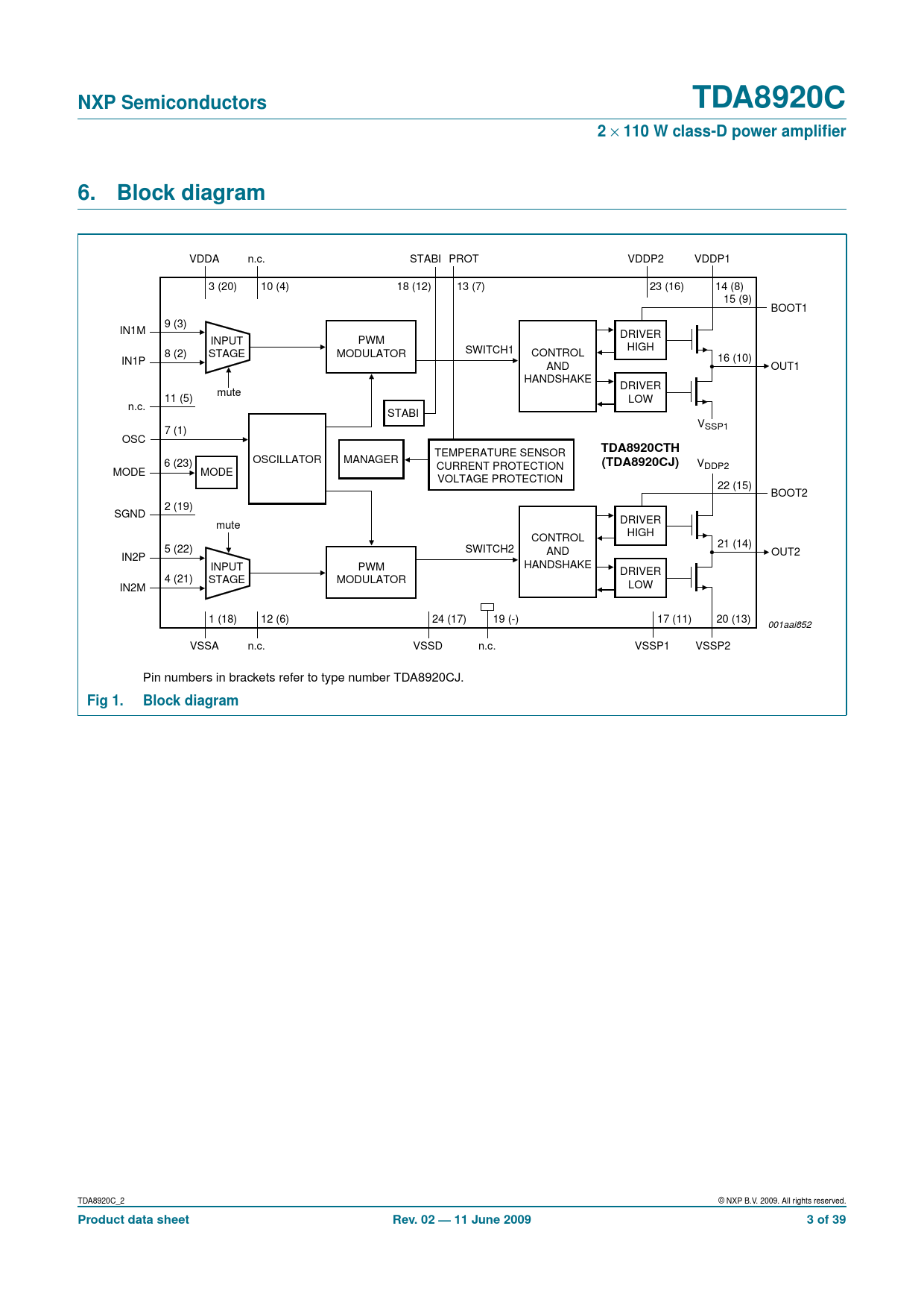 V CURRENT PROTECTION DDP2 MODE MODE VOLTAGE PROTECTION 22 (15) BOOT2 2 (19) SGND DRIVER mute HIGH CONTROL 21 (14) 5 (22) SWITCH2 AND OUT2 IN2P HANDSHAKE INPUT PWM DRIVER 4 (21) STAGE MODULATOR LOW IN2M 1 (18) 12 (6) 24 (17) 19 (-) 17 (11) 20 (13) 001aai852 VSSA n.c. VSSD n.c. VSSP1 VSSP2 Pin numbers in brackets refer to type number TDA8920CJ.
