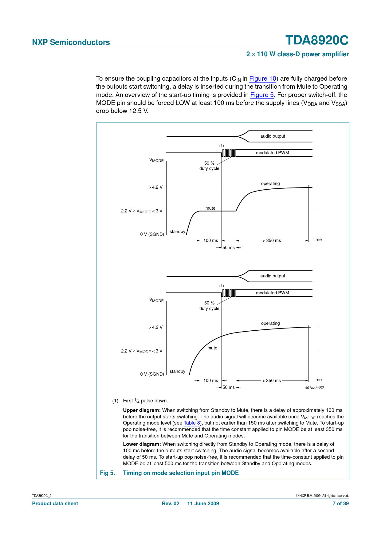To ensure the coupling capacitors at the inputs (CIN in Figure 10) are fully charged before the outputs start switching, a delay is inserted during the transition from Mute to Operating mode. An overview of the start-up timing is provided in Figure 5. For proper switch-off, the MODE pin should be forced LOW at least 100 ms before the supply lines (VDDA and VSSA) drop below 12.5 V. audio output (1) modulated PWM VMODE 50 % duty cycle operating > 4.2 V mute 2.2 V < VMODE < 3 V standby 0 V (SGND) time 100 ms > 350 ms 50 ms audio output (1) modulated PWM VMODE 50 % duty cycle operating > 4.2 V mute 2.2 V < VMODE < 3 V standby 0 V (SGND) time 100 ms > 350 ms 50 ms 001aah657 (1) First 1⁄4 pulse down.