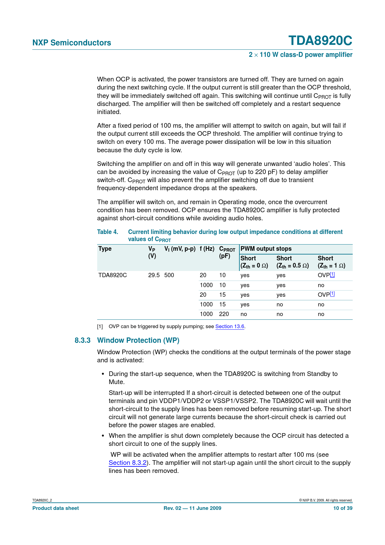 When the amplifier is shut down completely because the OCP circuit has detected a short circuit to one of the supply lines. WP will be activated when the amplifier attempts to restart after 100 ms (see Section 8.3.2). The amplifier will not start-up again until the short circuit to the supply lines has been removed. TDA8920C_2 © NXP B.V. 2009. All rights reserved.