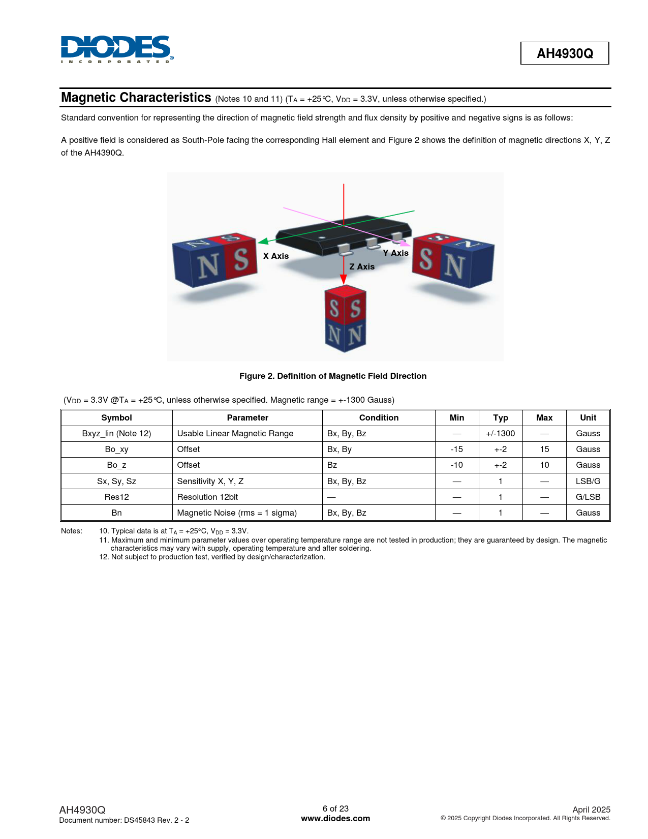 (Notes 10 and 11) (TA = +25°C, VDD = 3.3V, unless otherwise specified.) Standard convention for representing the direction of magnetic field strength and flux density by positive and negative signs is as follows: A positive field is considered as South-Pole facing the corresponding Hall element and Figure 2 shows the definition of magnetic directions X, Y, Z of the AH4390Q.