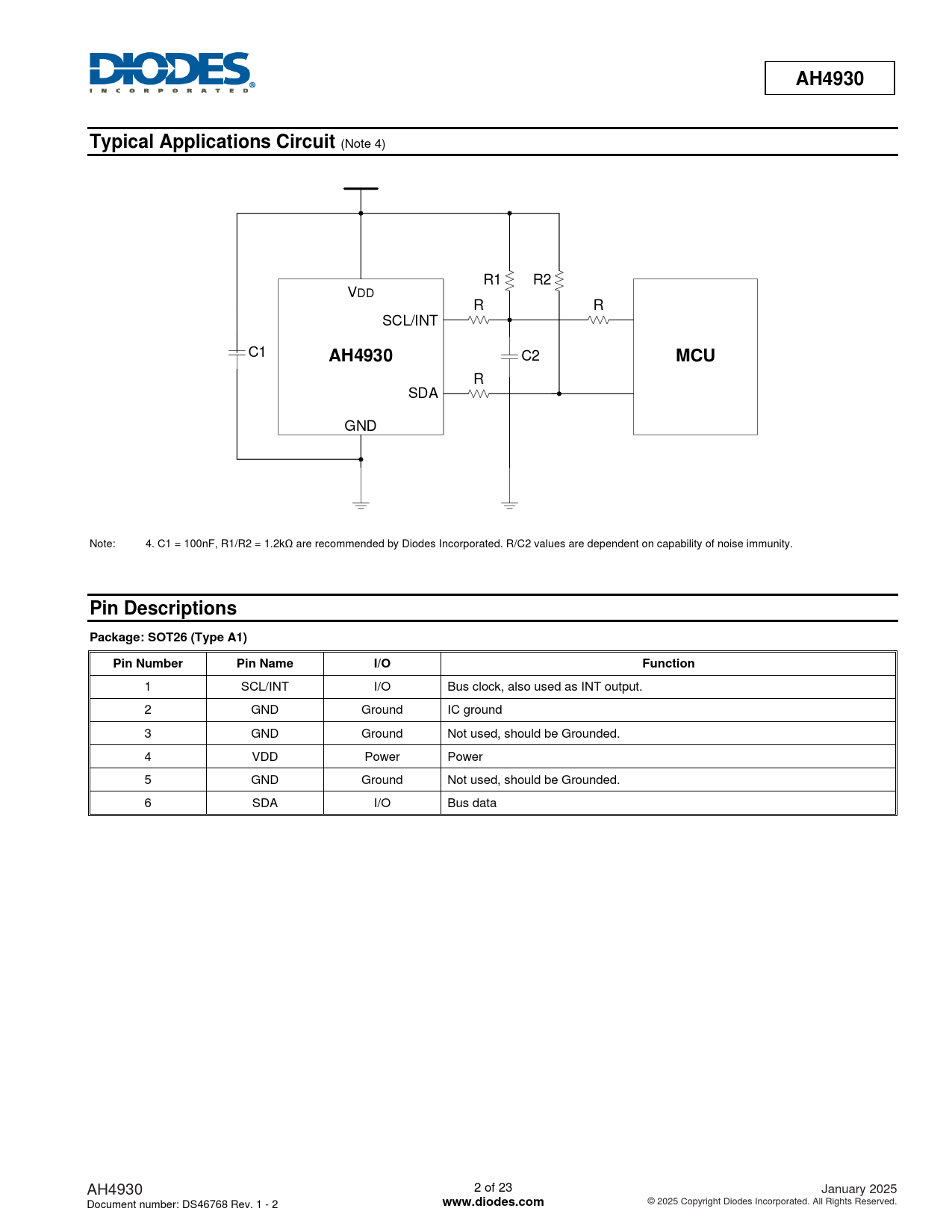 1 SCL/INT I/O Bus clock, also used as INT output. 2 GND Ground IC ground 3 GND Ground Not used, should be Grounded. 4 VDD Power Power 5 GND Ground Not used, should be Grounded. 6 SDA I/O Bus data AH4930 2 of 23 January 2025 Document number: DS46768 Rev. 1 - 2