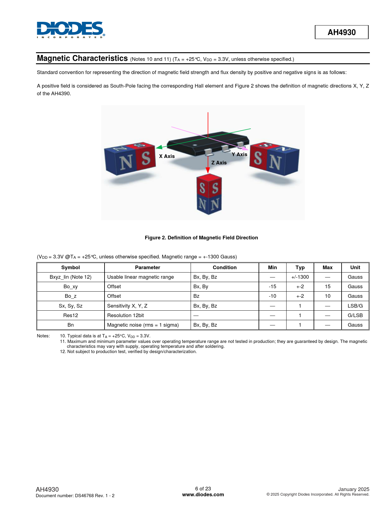 (Notes 10 and 11) (TA = +25°C, VDD = 3.3V, unless otherwise specified.) Standard convention for representing the direction of magnetic field strength and flux density by positive and negative signs is as follows: A positive field is considered as South-Pole facing the corresponding Hall element and Figure 2 shows the definition of magnetic directions X, Y, Z of the AH4390.