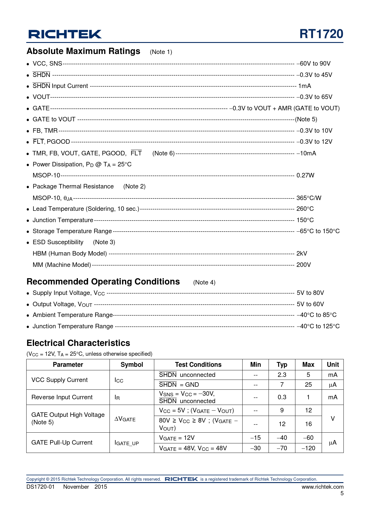 RT1720. Absolute Maximum Ratings. Recommended Operating Conditions. Electrical Characteristics. Parameter. Symbol. Test Conditions