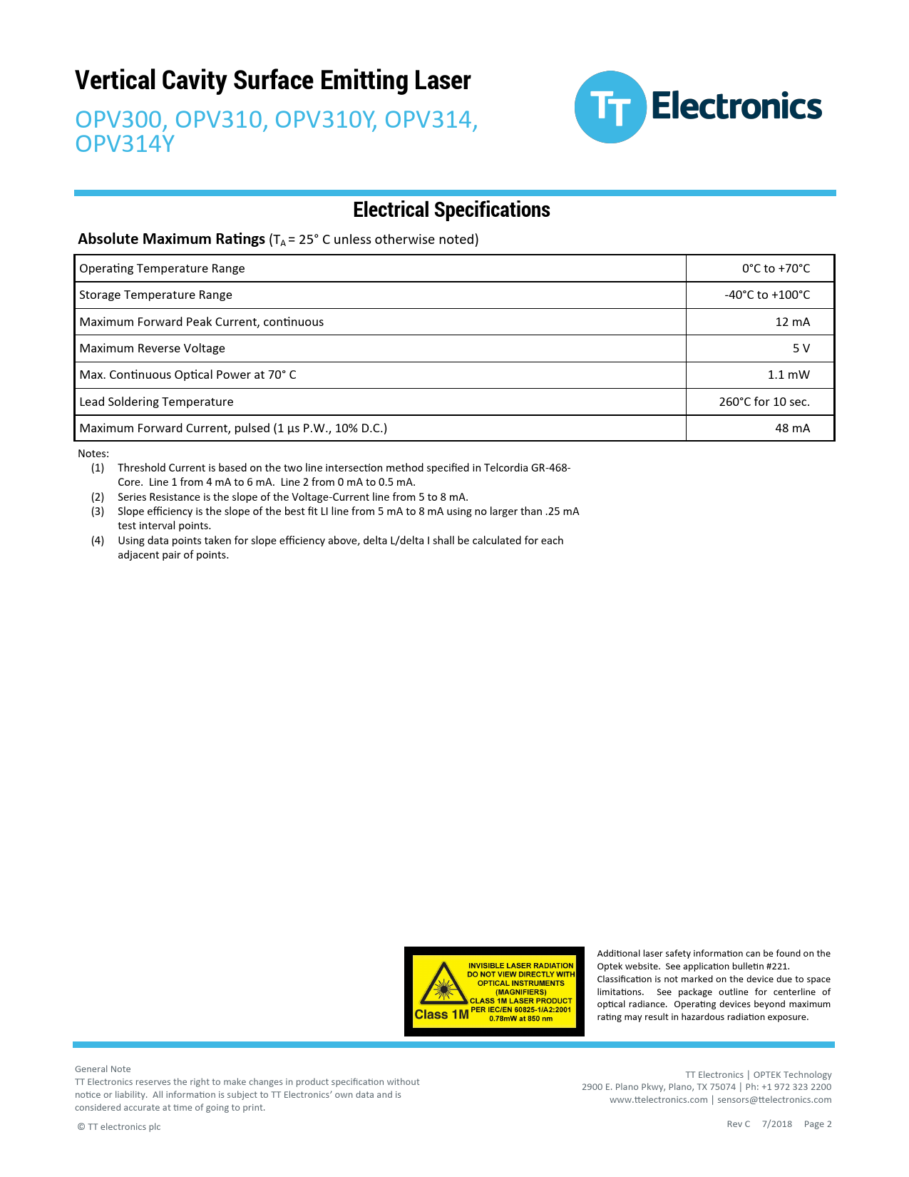 (TA = 25° C unless otherwise noted) Operating Temperature Range 0°C to +70°C Storage Temperature Range -40°C to +100°C Maximum Forward Peak Current, continuous 12 mA Maximum Reverse Voltage 5 V Max. Continuous Optical Power at 70° C 1.1 mW Lead Soldering Temperature 260°C for 10 sec. Maximum Forward Current, pulsed (1 µs P.W., 10% D.C.) 48 mA Notes: (1) Threshold Current is based on the two line intersection method specified in Telcordia GR-468- Core. Line 1 from 4 mA to 6 mA. Line 2 from 0 mA to 0.5 mA. (2) Series Resistance is the slope of the Voltage-Current line from 5 to 8 mA. (3) Slope efficiency is the slope of the best fit LI line from 5 mA to 8 mA using no larger than .25 mA test interval points. (4) Using data points taken for slope efficiency above, delta L/delta I shall be calculated for each adjacent pair of points. Additional laser safety information can be found on the Optek website. See application bulletin #221. Classification is not marked on the device due to space limitations. See package outline for centerline of optical radiance. Operating devices beyond maximum rating may result in hazardous radiation exposure. General Note TT Electronics | OPTEK Technology TT Electronics reserves the right to make changes in product specification without 2900 E. Plano Pkwy, Plano, TX 75074 | Ph: +1 972 323 2200 notice or liability. All information is subject to TT Electronics’ own data and is www.ttelectronics.com | sensors@ttelectronics.com considered accurate at time of going to print. © TT electronics plc Rev C 7/2018 Page 2