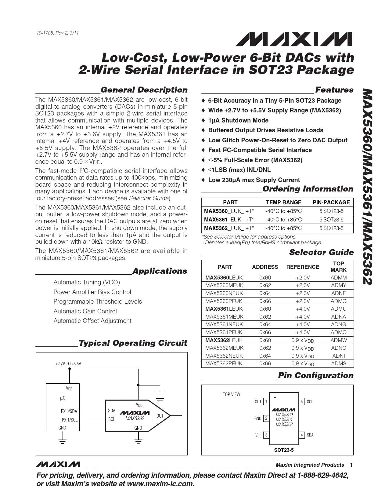 Low-Cost, Low-Power 6-Bit DACs with 2-Wire Serial Interface in SOT23 Package MAX5360/MAX5361/MAX5362 General Description Features