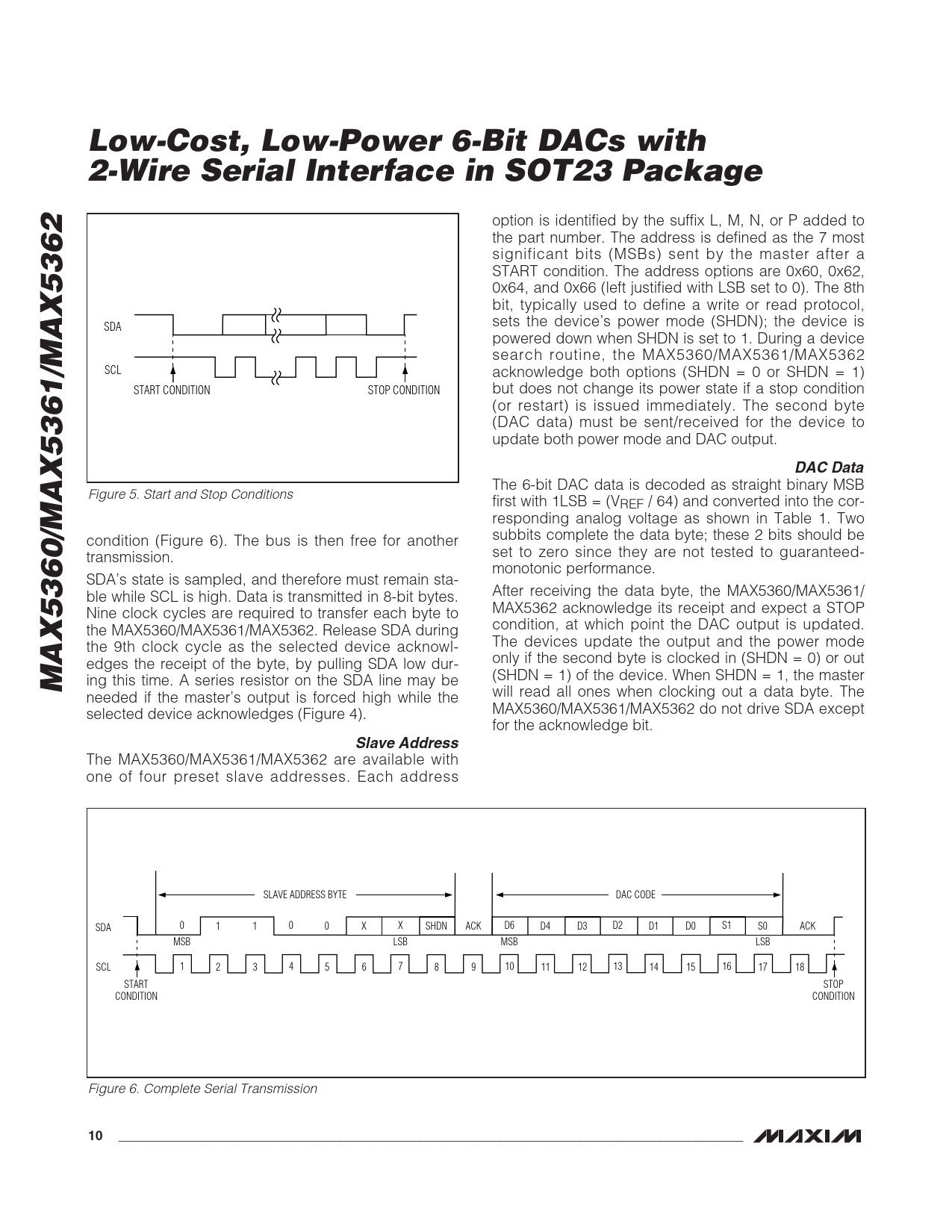 The MAX5360/MAX5361/MAX5362 are available with one of four preset slave addresses. Each address SLAVE ADDRESS BYTE DAC CODE SDA 0 1 1 0 0 X X SHDN ACK D6 D4 D3 D2 D1 D0 S1 S0 ACK MSB LSB MSB LSB SCL 1 2 3 4 5 6 7 8 9 10 11 12 13 14 15 16 17 18 START STOP CONDITION CONDITION Figure 6. Complete Serial Transmission