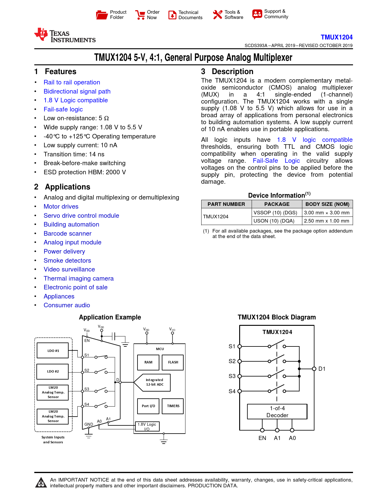 link to page 19 link to page 19 link to page 19 link to page 19 link to page 19 link to page 19 link to page 1 Product Order Technical Tools & Support & Folder Now Documents Software Community TMUX1204 SCDS393A – APRIL 2019 – REVISED OCTOBER 2019 TMUX1204 5-V, 4:1, General Purpose Analog Multiplexer1 Features3 Description • Rail to rail operation The TMUX1204 is a modern complementary metal- 1 oxide semiconductor (CMOS) analog multiplexer • Bidirectional signal path (MUX) in a 4:1 single-ended (1-channel) • 1.8 V Logic compatible configuration. The TMUX1204 works with a single • Fail-safe logic supply (1.08 V to 5.5 V) which allows for use in a broad array of applications from personal electronics • Low on-resistance: 5 Ω to building automation systems. A low supply current • Wide supply range: 1.08 V to 5.5 V of 10 nA enables use in portable applications. • -40°C to +125°C Operating temperature All logic inputs have 1.8 V logic compatible • Low supply current: 10 nA thresholds, ensuring both TTL and CMOS logic • Transition time: 14 ns compatibility when operating in the valid supply • Break-before-make switching voltage range. Fail-Safe Logic circuitry allows voltages on the control pins to be applied before the • ESD protection HBM: 2000 V supply pin, protecting the device from potential damage. 2 Applications • Analog and digital multiplexing or demultiplexing Device Information(1) • Motor drives PART NUMBERPACKAGEBODY SIZE (NOM) VSSOP (10) (DGS) 3.00 mm × 3.00 mm • Servo drive control module TMUX1204 USON (10) (DQA) 2.50 mm x 1.00 mm • Building automation • Barcode scanner (1) For all available packages, see the package option addendum at the end of the data sheet. • Analog input module SPACER • Power delivery SPACER • Smoke detectors • Video surveillance • Thermal imaging camera • Electronic point of sale • Appliances • Consumer audio Application ExampleTMUX1204 Block Diagram VDD V V DD DD VI/O TMUX120 4 EN S1 MCULDO #1 S1 RAMFLASH S2 D1 S2 LDO #2 S3 D Int egrated12-bit ADCLM20 S3 Analog Temp. S4 Sensor S4 Port I/OTIMERS 1-of-4 LM20Analog Temp. Decoder A1 Sensor A0 GND 1.8V Logic I/O System Inputs EN A1 A0 and Sensors 1 An IMPORTANT NOTICE at the end of this data sheet addresses availability, warranty, changes, use in safety-critical applications, intellectual property matters and other important disclaimers. PRODUCTION DATA. Document Outline 1 Features 2 Applications 3 Description Table of Contents 4 Revision History 5 Pin Configuration and Functions 6 Specifications 6.1 Absolute Maximum Ratings 6.2 ESD Ratings 6.3 Recommended Operating Conditions 6.4 Thermal Information 6.5 Electrical Characteristics (VDD = 5 V ±10 %) 6.6 Electrical Characteristics (VDD = 3.3 V ±10 %) 6.7 Electrical Characteristics (VDD = 1.8 V ±10 %) 6.8 Electrical Characteristics (VDD = 1.2 V ±10 %) 6.9 Typical Characteristics 7 Parameter Measurement Information 7.1 On-Resistance 7.2 Off-Leakage Current 7.3 On-Leakage Current 7.4 Transition Time 7.5 Break-Before-Make 7.6 tON(EN) and tOFF(EN) 7.7 Charge Injection 7.8 Off Isolation 7.9 Crosstalk 7.10 Bandwidth 8 Detailed Description 8.1 Functional Block Diagram 8.2 Feature Description 8.2.1 Bidirectional Operation 8.2.2 Rail to Rail Operation 8.2.3 1.8 V Logic Compatible Inputs 8.2.4 Fail-Safe Logic 8.3 Device Functional Modes 8.4 Truth Tables 9 Application and Implementation 9.1 Application Information 9.2 Typical Application 9.3 Design Requirements 9.4 Detailed Design Procedure 9.5 Application Curve 10 Power Supply Recommendations 11 Layout 11.1 Layout Guidelines 11.1.1 Layout Information 11.2 Layout Example 12 Device and Documentation Support 12.1 Documentation Support 12.1.1 Related Documentation 12.2 Receiving Notification of Documentation Updates 12.3 Community Resources 12.4 Trademarks 12.5 Electrostatic Discharge Caution 12.6 Glossary 13 Mechanical, Packaging, and Orderable Information