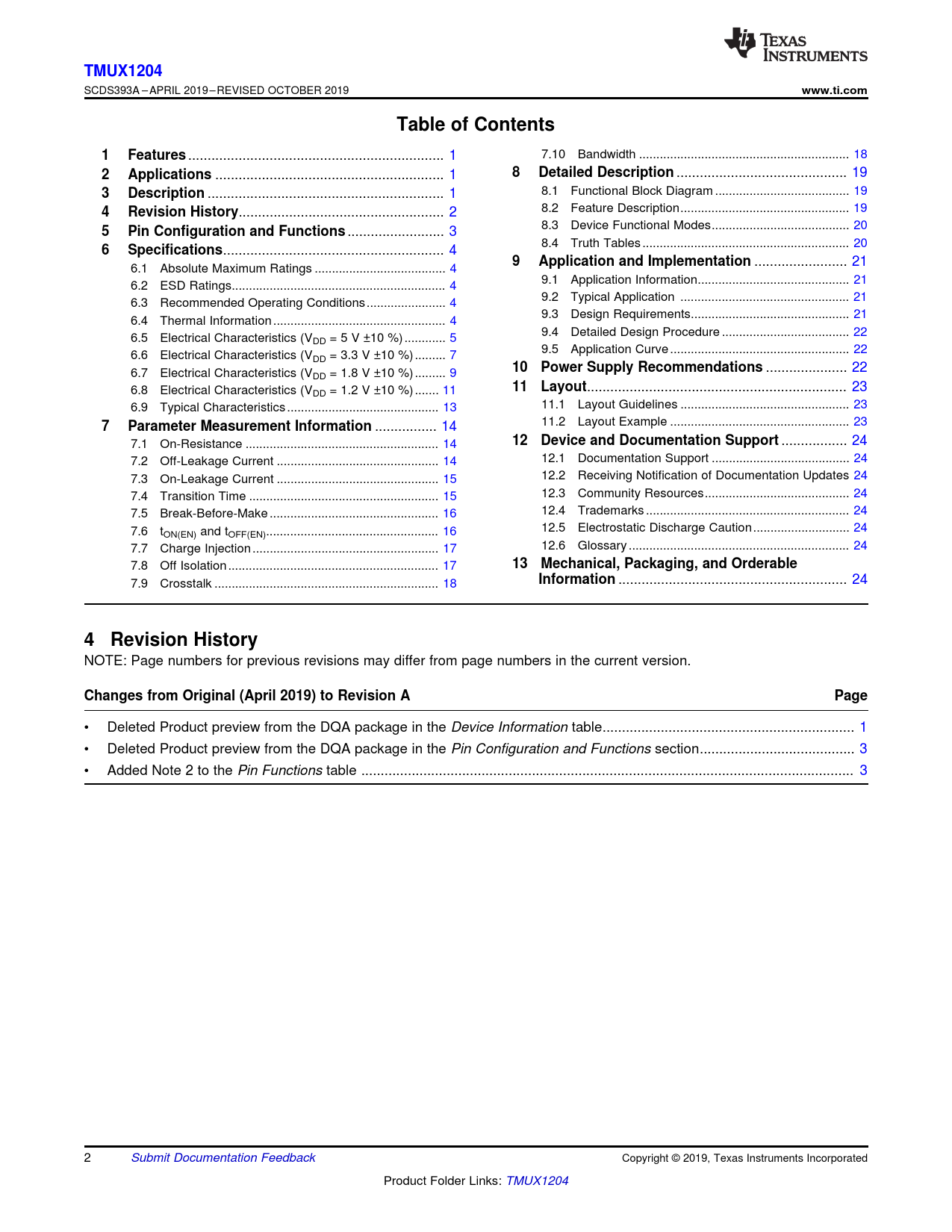 | Pages / Page | 35 / 2 — TMUX1204. www.ti.com. Table of Contents. Features. Applications. Detailed … |