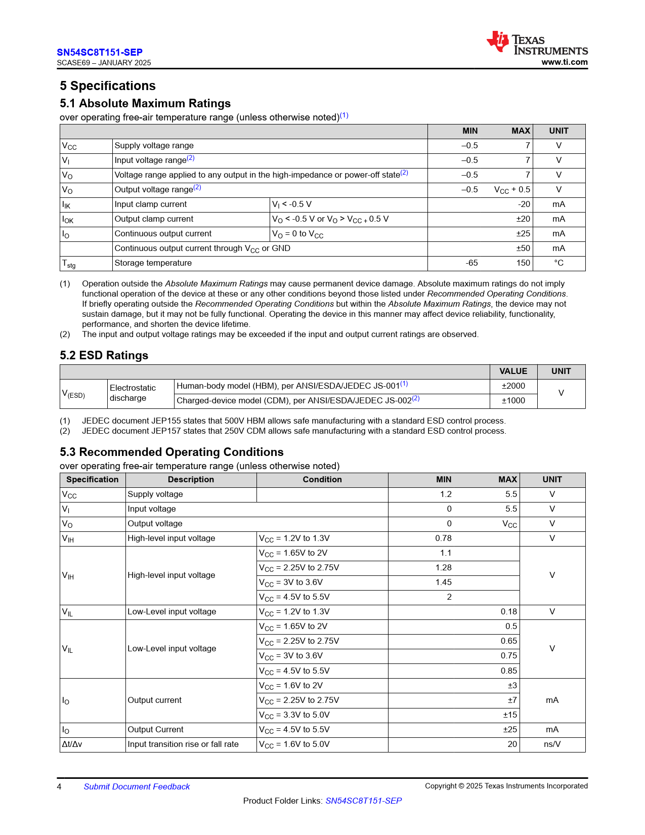 SN54SC8T151-SEP. www.ti.com. 5 Specifications 5.1 Absolute Maximum Ratings. MIN. MAX. UNIT. 5.2 ESD Ratings. VALUE