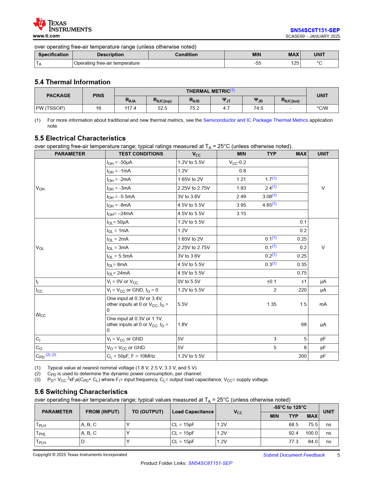 SN54SC8T151-SEP. www.ti.com. Specification. Description. Condition. MIN. MAX. UNIT. 5.4 Thermal Information. THERMAL METRIC. PACKAGE. PINS