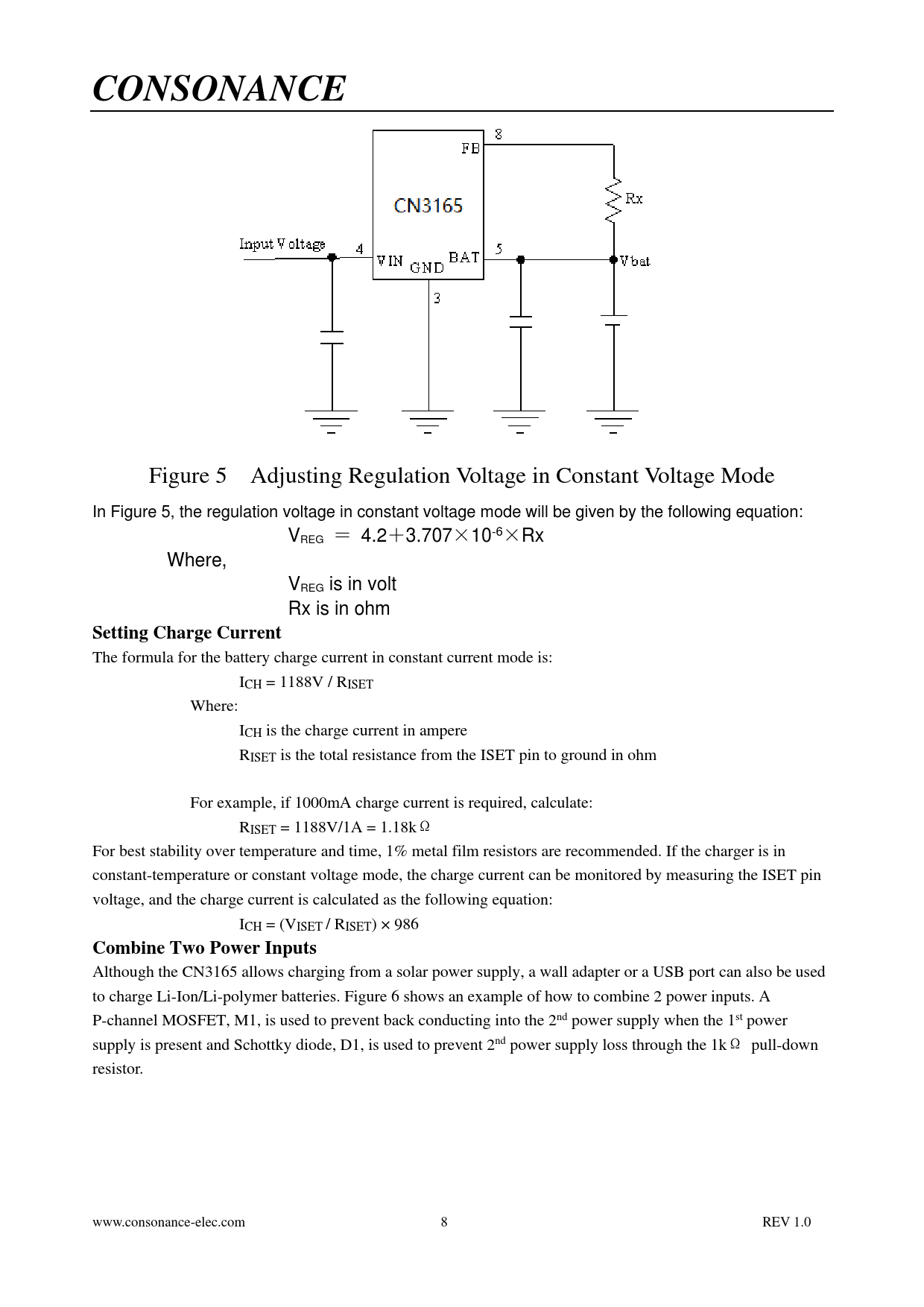CONSONANCE Figure 5 Adjusting Regulation Voltage in Constant Voltage Mode In Figure 5, the regulation voltage in constant voltage mode will be given by the following equation: VREG = 4.2+3.707×10-6×Rx Where, VREG is in volt Rx is in ohm Setting Charge Current The formula for the battery charge current in constant current mode is: ICH = 1188V / RISET Where: ICH is the charge current in ampere RISET is the total resistance from the ISET pin to ground in ohm For example, if 1000mA charge current is required, calculate: RISET = 1188V/1A = 1.18kΩ For best stability over temperature and time, 1% metal film resistors are recommended. If the charger is in constant-temperature or constant voltage mode, the charge current can be monitored by measuring the ISET pin voltage, and the charge current is calculated as the following equation: ICH = (VISET / RISET) × 986 Combine Two Power Inputs Although the CN3165 allows charging from a solar power supply, a wall adapter or a USB port can also be used to charge Li-Ion/Li-polymer batteries. Figure 6 shows an example of how to combine 2 power inputs. A P-channel MOSFET, M1, is used to prevent back conducting into the 2nd power supply when the 1st power supply is present and Schottky diode, D1, is used to prevent 2nd power supply loss through the 1kΩ pull-down resistor. www.consonance-elec.com 8 REV 1.0